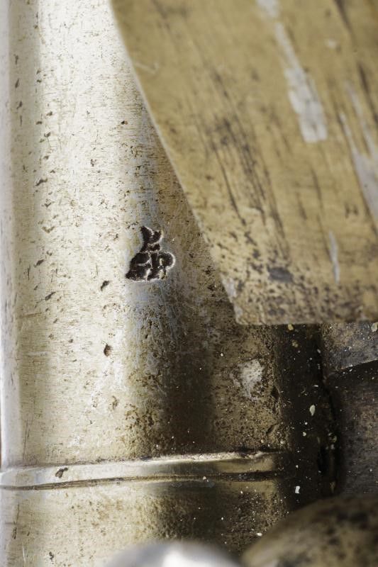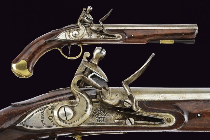 Regno Unito, lunghezza 39.5 cm. primo quarto del XIX Sec. Canna tonda liscia, con anellatura di rinforzo in culatta, punzone alla base, cal. 15 mm. in volata. Batteria a pietra focaia marcata 'GR' sotto corona e 'TOWER', i bordi della cartella con doppie linee. Cassa intera in legno con fornimenti in ottone e gancio da cintura in ferro. Bacchetta in legno.