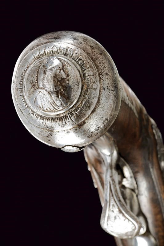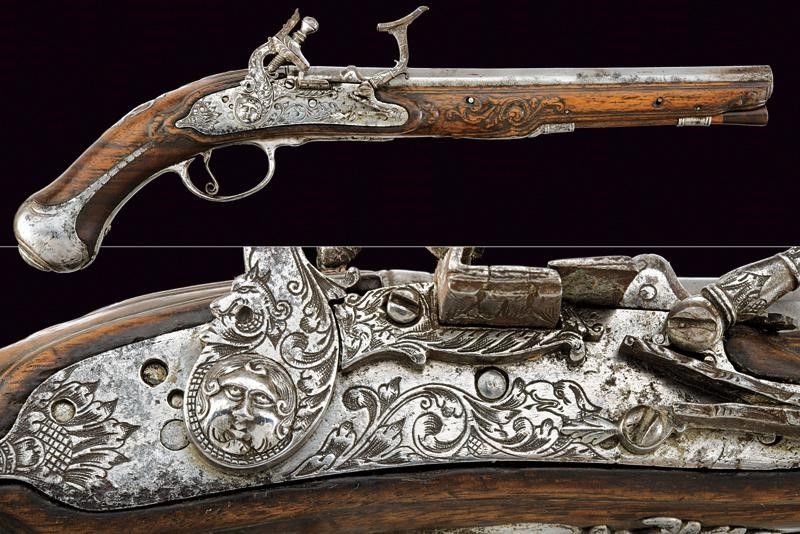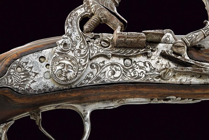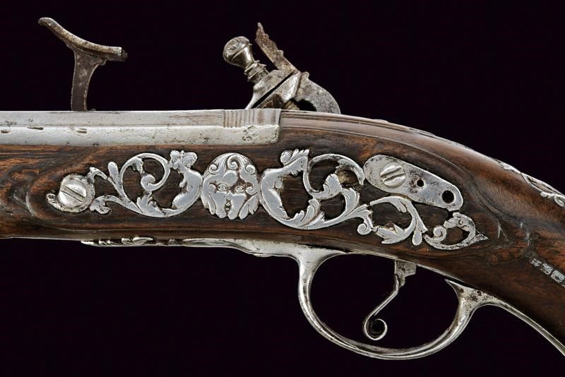 Area Tosco-Emiliana, lunghezza 38 cm. fine del XVIII Sec. Canna tonda liscia, piatta al dorso, con anellature in culatta, recante resti di marcatura con lettere non chiaramente leggibili, cal. 13 mm. in volata. Batteria a pietra incisa a fiorami (meccanica da rivedere, rottura alla molletta interna dello scatto e mancanza). La testa del vitone del cane lavorata a testa di putto. Cassa intera in legno con intagli floreali. Fornimenti in ferro parzialmente incisi. La contropiastra con grottesche a traforo ed intaglio. Gancio da cintura mancante. Bacchetta in legno. Scudetto dorsale coronato. Merita un adeguato restauro.