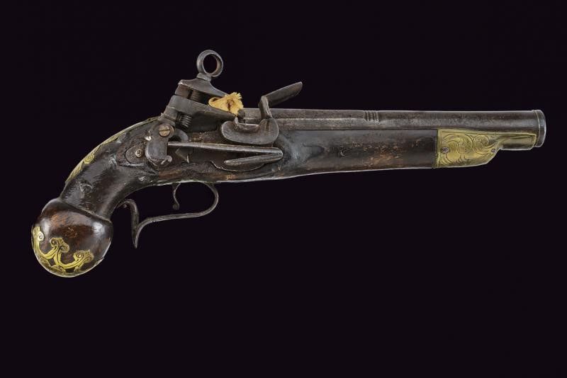 Spagna, lunghezza 30 cm. Seconda metà del XVIII secolo Canna liscia a due ordini, ottagonale e tonda, con anellature al cambio e gioia di bocca in volata, cal. 18,7 mm. Batteria a pietra focaia con meccanica funzionante (problemi di tenuta al primo scatto). Cassa intera in legno con segni d'uso e del tempo. Fornimenti in ottone. Coccia con traforo e incisioni a rosetta, bocchino in ottone massiccio, inciso a fiorami e con bacchetta mancante. Tipica cornicetta attorno al codolo della canna. Gancio da cintura in ferro. Le parti in ferro in bella patina antica.