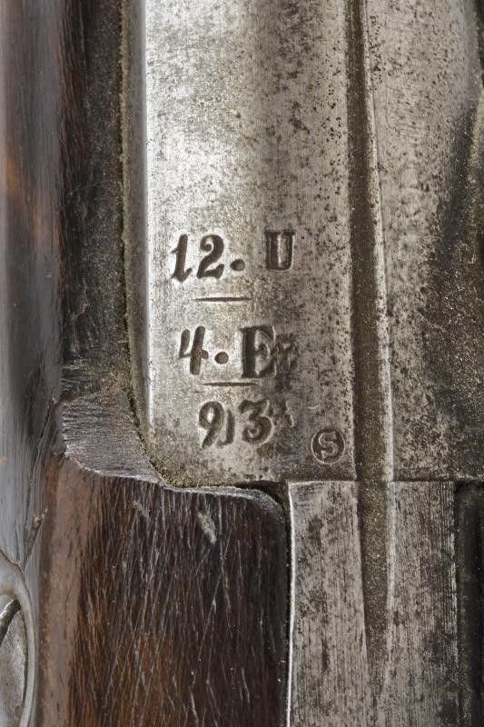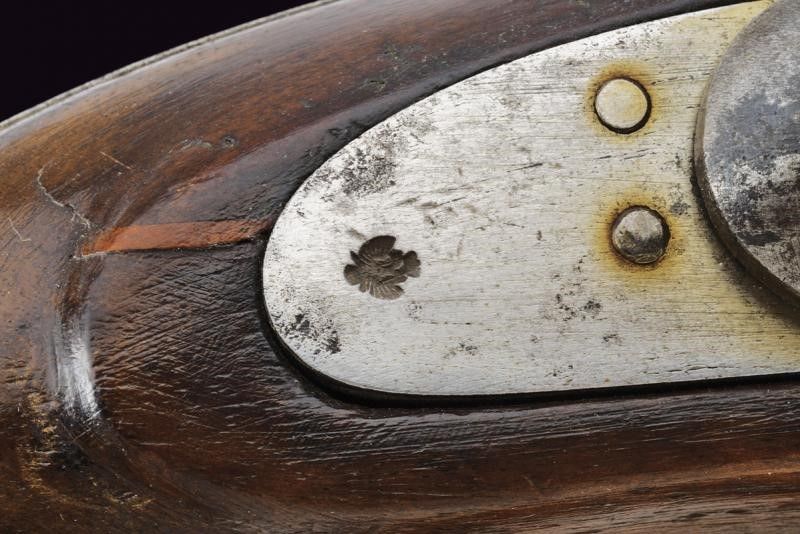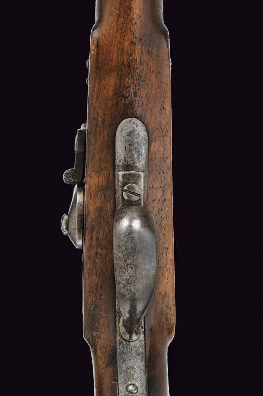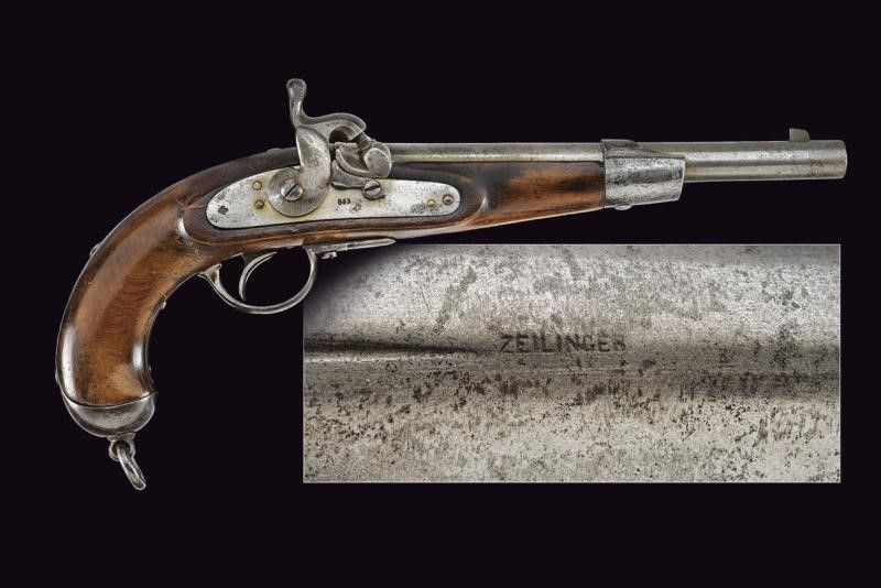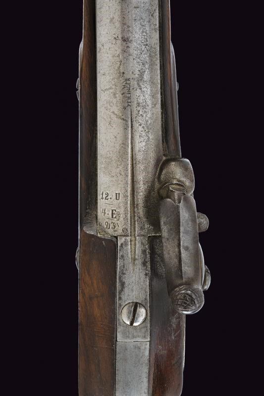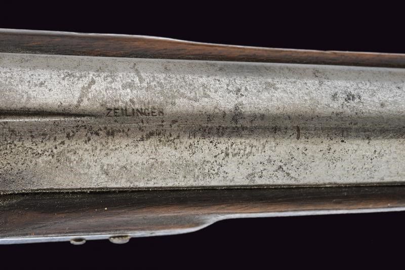 1863 Canna tonda rigata, marcata 'ZEILINGER', con punzone 'S' e '12.U 4.E 23'; la base con sottile scanalatura, la volata con mirino alto, cal. 13,9 mm. Batteria a molla in avanti, datata '863' e punzonata con aquila bicipite, dotata di sicura; cassa a tre quarti in legno, con fornimenti in acciaio. Anello di sospensione.