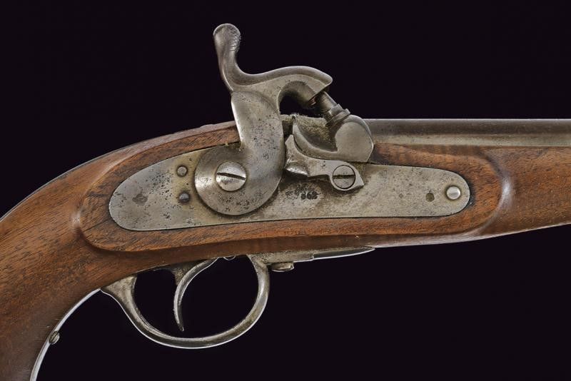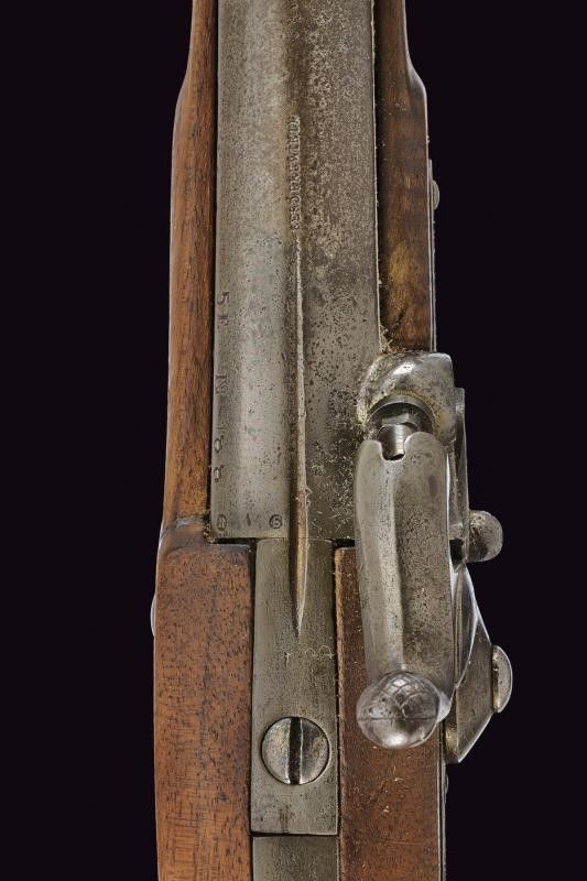 Austria, lunghezza 42 cm. 1862 Canna tonda rigata, marcata 'FERD. FRUWIRTH', sulla culatta i punzoni '5 E N 188' e 'R'; cal. 13,9 mm. Batteria a molla in avanti, datata '862' e punzonata con aquila bicipite, dotata di sicura; cassa a tre quarti in legno, con fornimenti punzonati, in acciaio. Coccia con anello di sospensione.