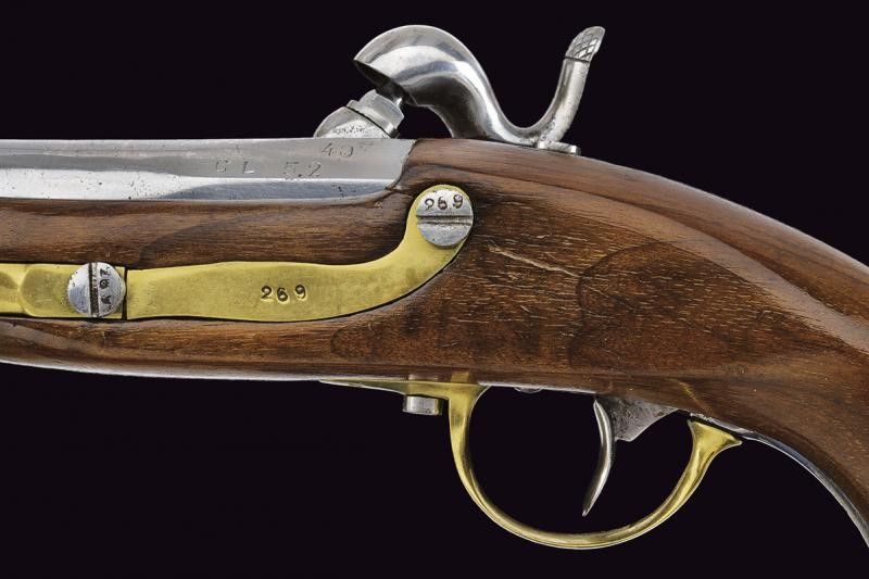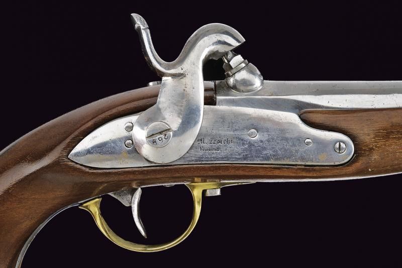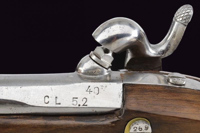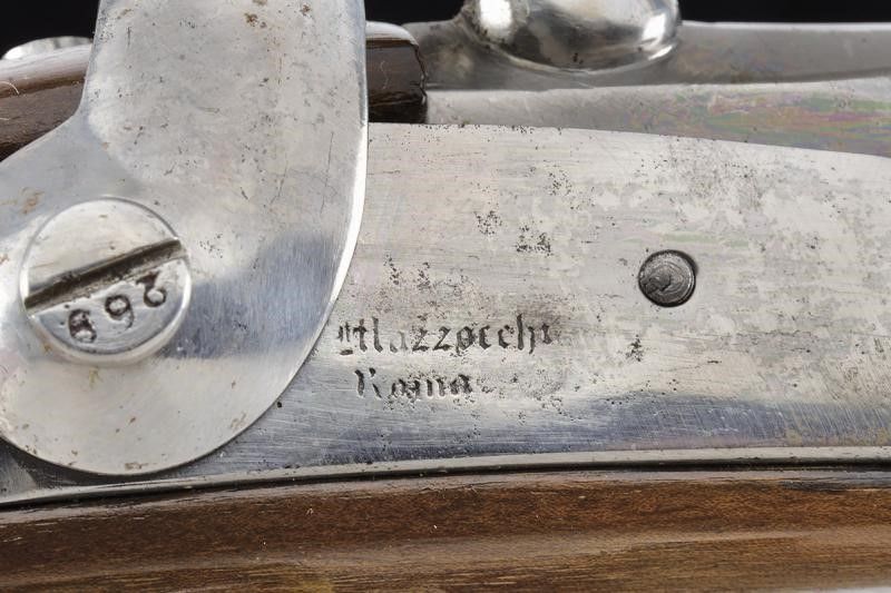 Stato Pontificio, lunghezza 25.5 cm. Metà del XIX Secolo Canna tonda liscia con culatta ottagonale, marcata 'CL', '50' e '5.2'; cal. 15,5 mm. Batteria a molla in avanti con cartella marcata 'Mazzocchi / Roma'. Cassa a tre quarti in legno con fornimenti in ottone. Bacchetta in ferro. Fornimenti e viti numerati '269'.