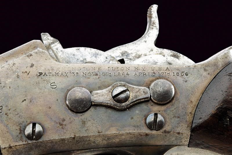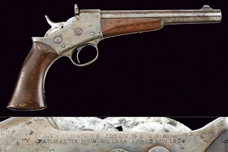 USA, lunghezza 333 cm. 1875-1890 Canna rigata, tonda, brunita, cal. 50 centerfire; castello in ferro marcato 'REMINGTONS ILION N.Y. U.S.A. / PAT. MAY 3 NOV. 15th, 1864 APRIL 17th, 1866', 'P' e 'S'. Calcio e astina in legno, il primo con timbro d'ispezione militare.