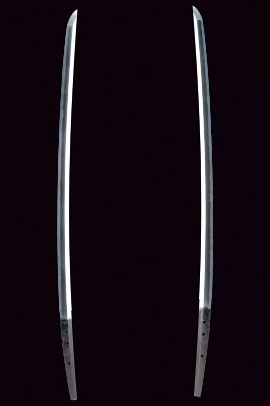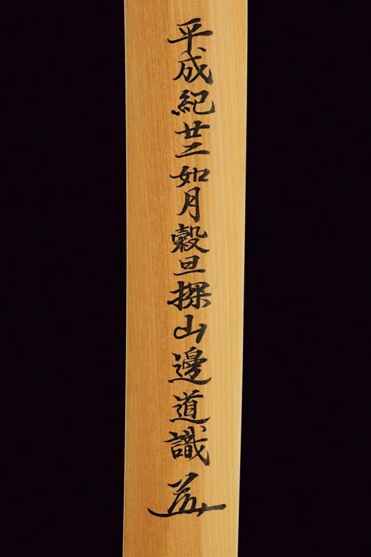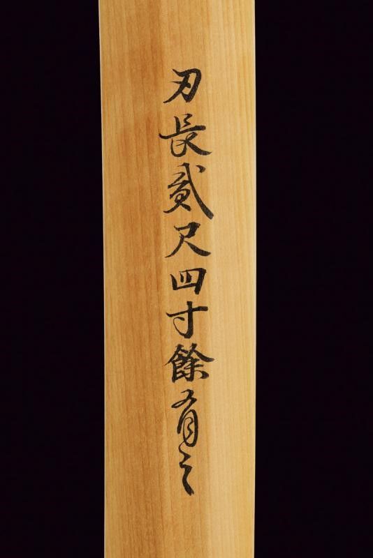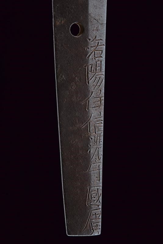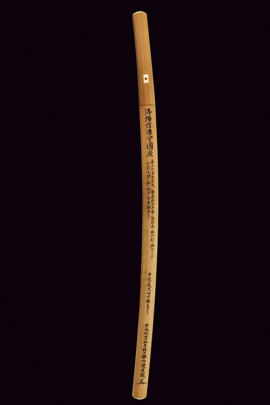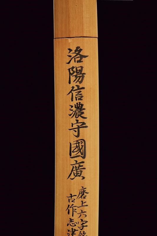 Giappone, lunghezza 97 cm. Periodo Edo (1603-1867) Elegante lama Shinogi-zukuri, Iori-mune. O-kissaki. Nagasa: 72,8 cm. Hamon e hada ben visibili. Nakago-Osuriage. Jiri: Kiri. Mei: Rakuyo ju Shinano no Kami Kunihiro. Tre Mekugi-ana. Inizio epoca Shinto. Habaki in metallo dorato. Conservata in Shirasaya con Saya-gaki del Sensei Tanobe.