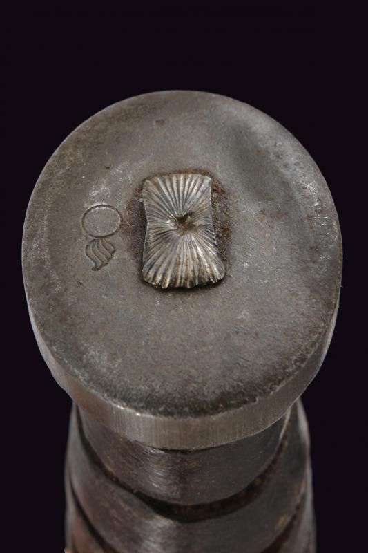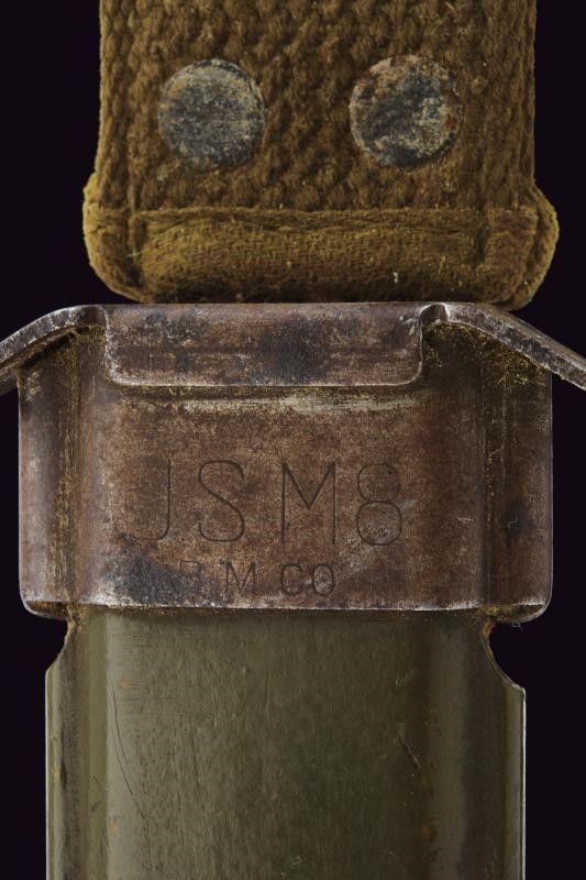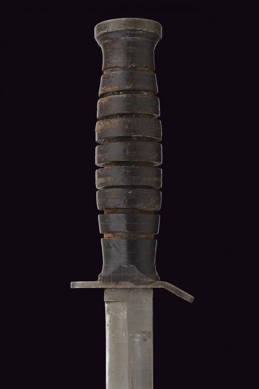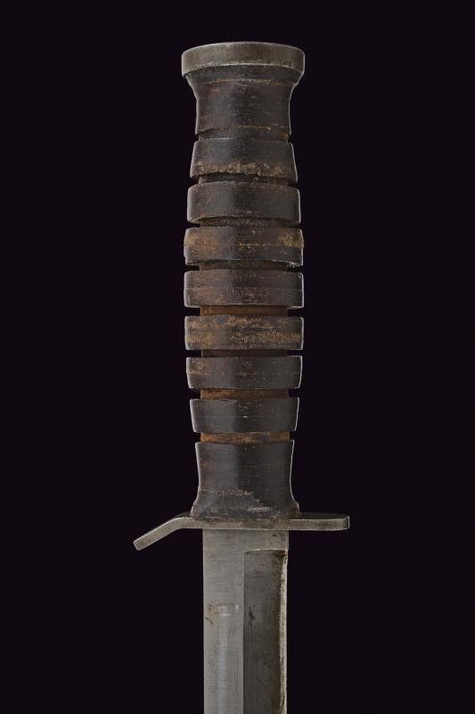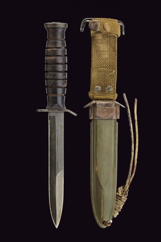 USA, lunghezza 29,4 cm. 1940 - 1945 circa Lama in buono stato con minimi segni d'uso. Crociera marcata 'US M3 IMPERIAL'. Impugnatura in cuoio. Cappellotto con bottone raggiato e punzone a granata fiammeggiante. Fodero in materiale composito tinto color verde e con cappa metallica marcata 'USM8 / ...MCO'. Taschetta con passante in tessuto grigioverde.