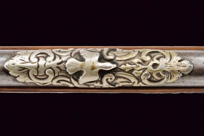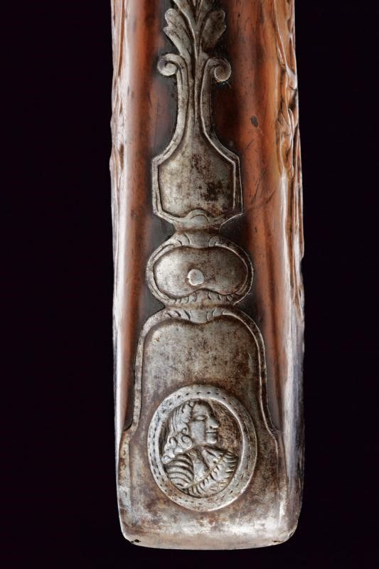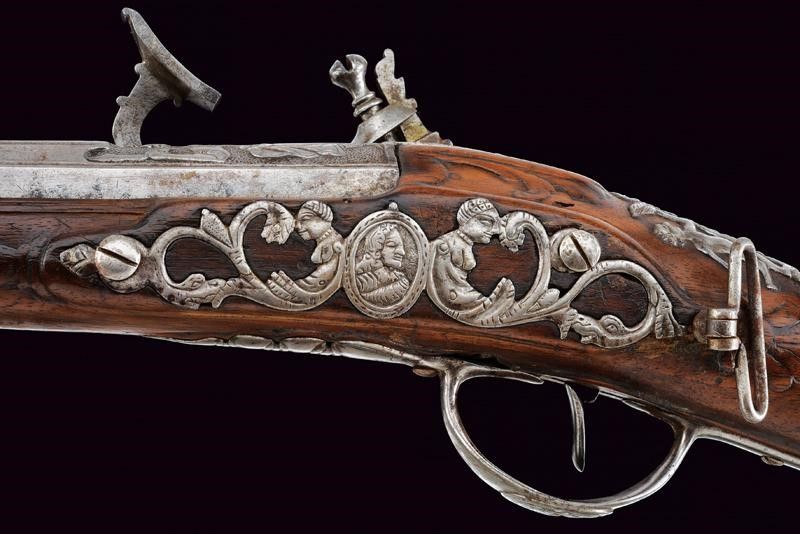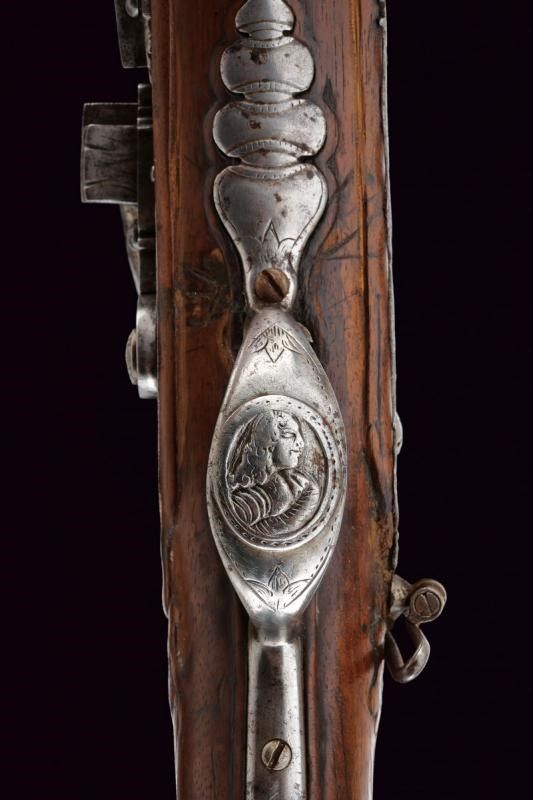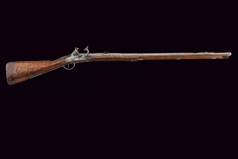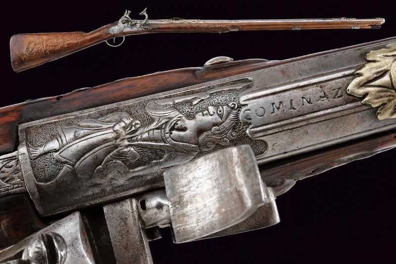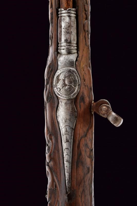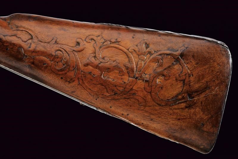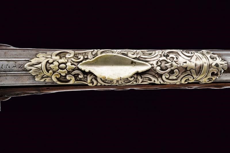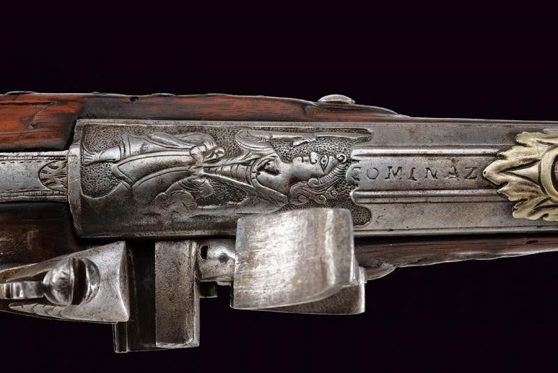 Prima metà del XVIII Secolo Bella canna riccamente decorata, a tre ordini: ottagonale, faccetta e tonda, con anellature al secondo cambio. In culatta un intaglio effigiante una dama su fondo a granuli, subito seguita dall'iscrizione 'COMINAZ', al cambio incisioni a foglie e un profilo. Sulla canna tre bei fornimenti lavorati in metallo color argento: il primo, ovvero l'alzo con ampia base ornata a rocaille e sormontata da corona, il secondo il mirino, realizzato a colomba in altorilievo e con una base en suite, il terzo borda la volata, tipo gioia di bocca, a decoro floreale. Cal. 15,8 mm. Batteria a pietra con cartella piatta incisa a fiorami, come anche il cane, questo anche con testa di lupo, incisa e sagomata anche la martellina. Meccanica funzionante. Marcatura del maestro 'GBC'. Cassa in legno riccamente intagliata (fori di tarlo restaurati). Bele trame di racemi che mutano in animali o personaggi grotteschi, sia sull'astina che sulla pala, altri piccoli fregi intagliati in vari punti. Fornimenti in ferro. Ponticello con profilo di un nobiluomo in rilievo, come anche il dorso del calcio e la contropiastra, questa anche con trafori a grottesche. Lo scudetto dorsale di bellissima fattura, con putti che reggono un ritratto femminile, e il tutto sormontato da testa di putto alato. Bacchetta in legno con battipalla in corno.