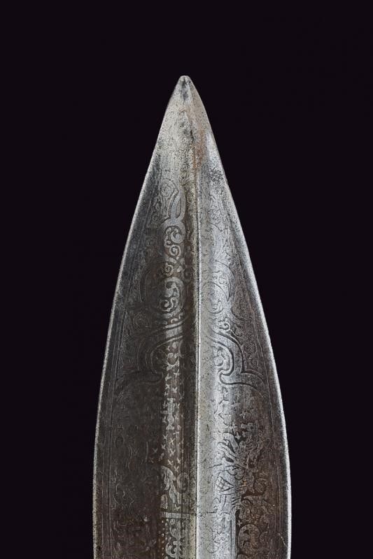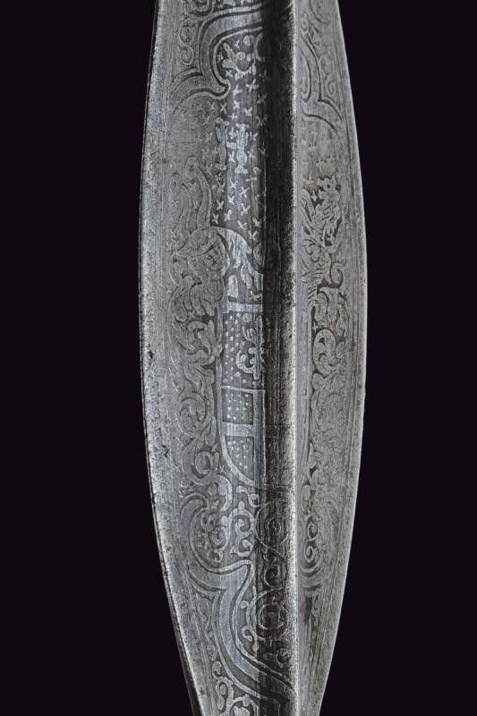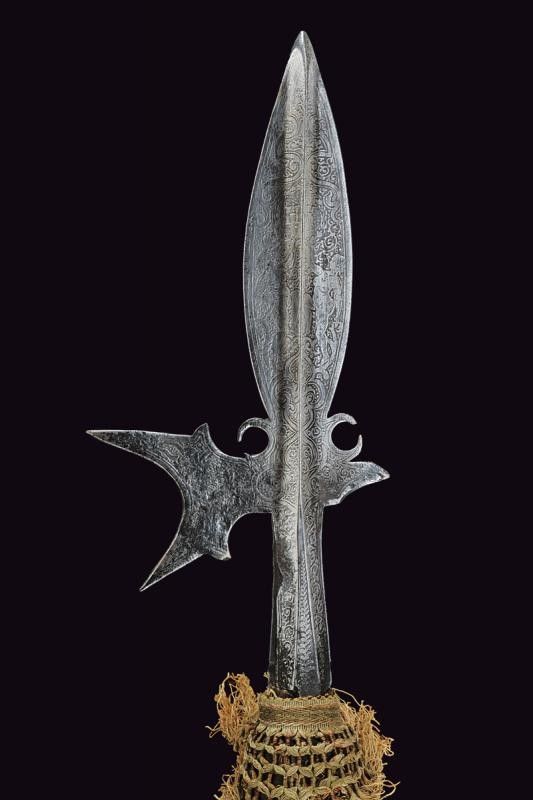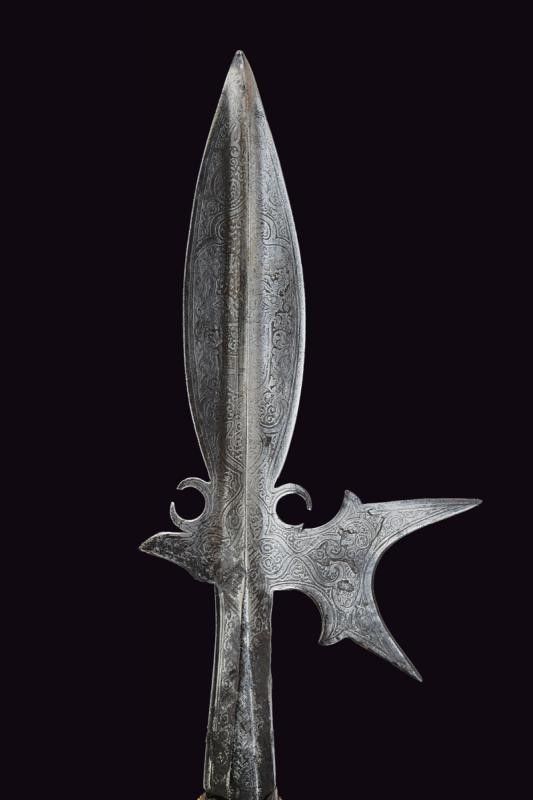 Germania, lunghezza 207 cm. fine del XVII Sec. In ferro, con cuspide a lama dotata di forte nervatura in mezzeria, scure con taglio molto incavato e munita di ricciolo a mezzaluna alla base, come anche il breve becco. Gorbia faccettata. La cuspide decorata al centro su una faccia con stemma cavalleresco circondato da bande e disegni floreali incisi, sull'altra con due figure muliebri sotto al monogramma 'HK'. Scure, becco e gorbia incisi a bande decorative e a motivi floreali, zone con danni da ruggine. Con bandelle piatte fissate su asta ottagonale in legno, decorata con nappa in tessuto e filo metallico.