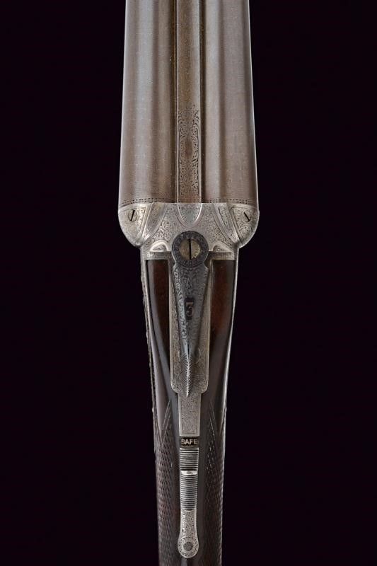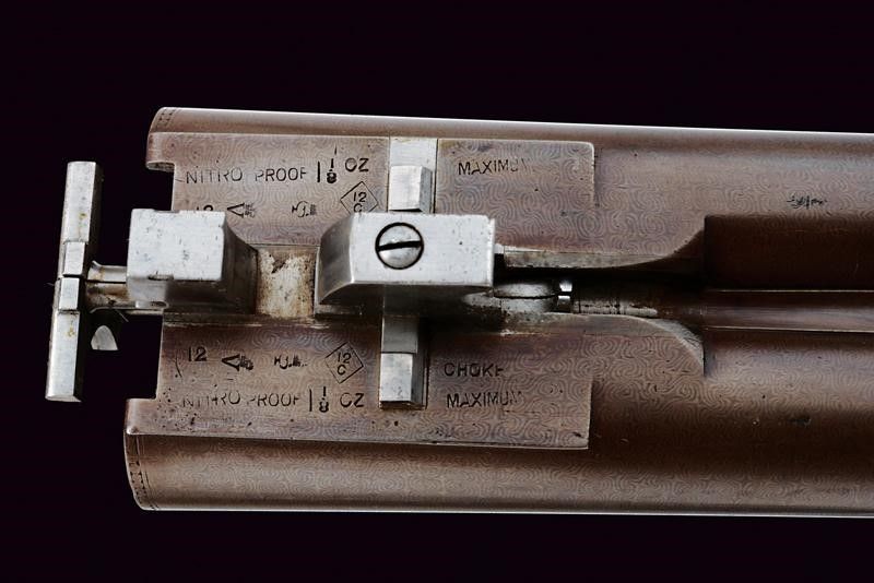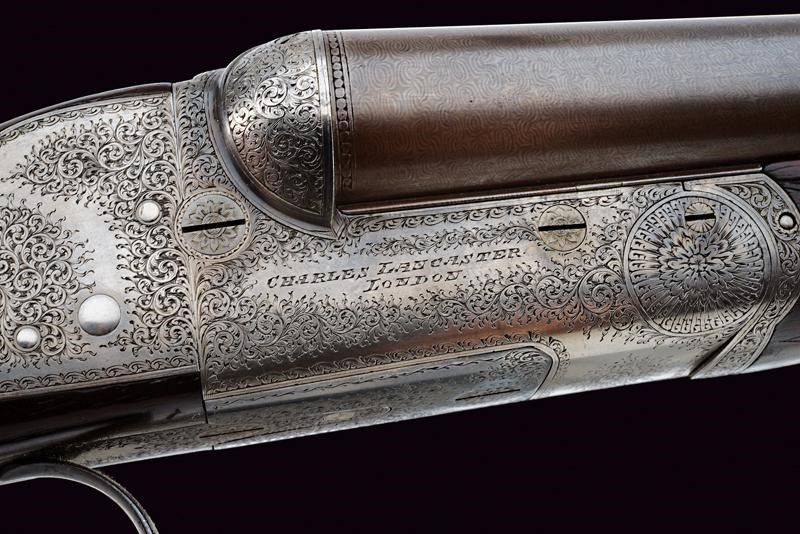 1885-90 Belle canne tonde lisce, basculanti, in damasco, marcate nella parte inferiore 'CL', '12', recanti punzoni dei banchi di prova, munite di bindella con mirino in argento e culatta marcata con il numero '3' sempre in argento, incisa a racemi alla base e marcata 'CHARLES LANCASTER 151 NEW BOND St. LONDON PATENT EJECTOR'. cal. 12. Bascula interamente incisi a racemi, sui fianchi le marcature 'CHARLES LANCASTER LONDON' e 'CHARLES LANCASTER PATENT', la leva d'apertura - anche questa numerata '3' - ed il ponticello conservano il 90% della brunitura originale, sul codolo è presente la sicura manuale a scorrimento. Calcio ed astina, la cui leva è brunita e numerata en suite, entrambi in legno zigrinato, nella parte inferiore uno scudetto dorato. Numeri di matricola '8498' coevi su tutti i componenti. L'interno delle canne in condizioni perfette.