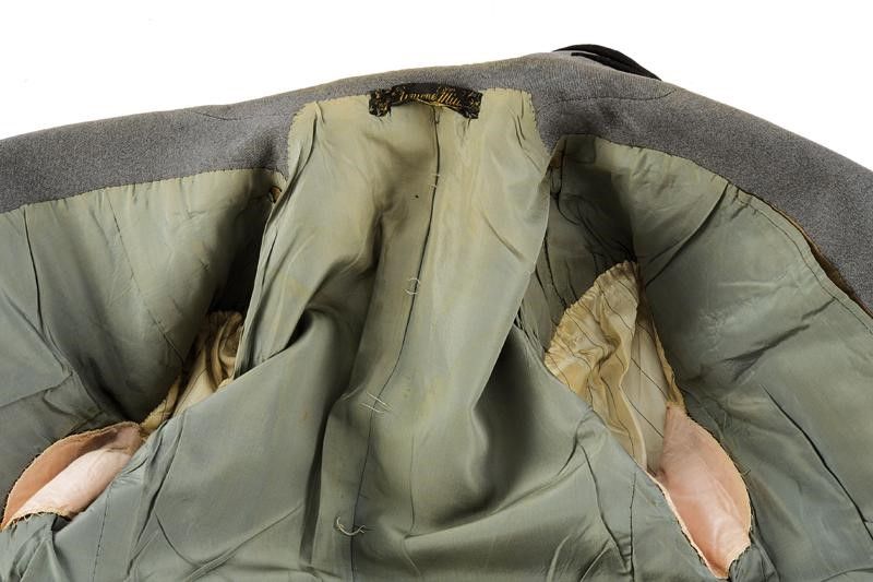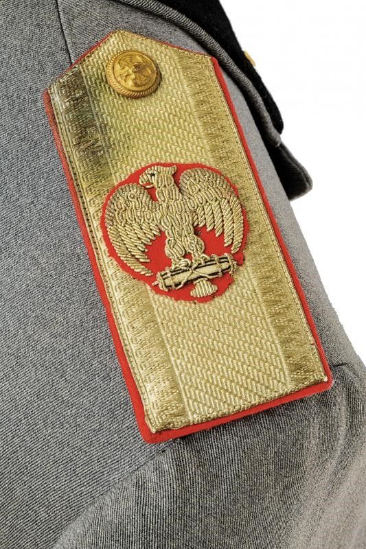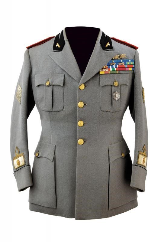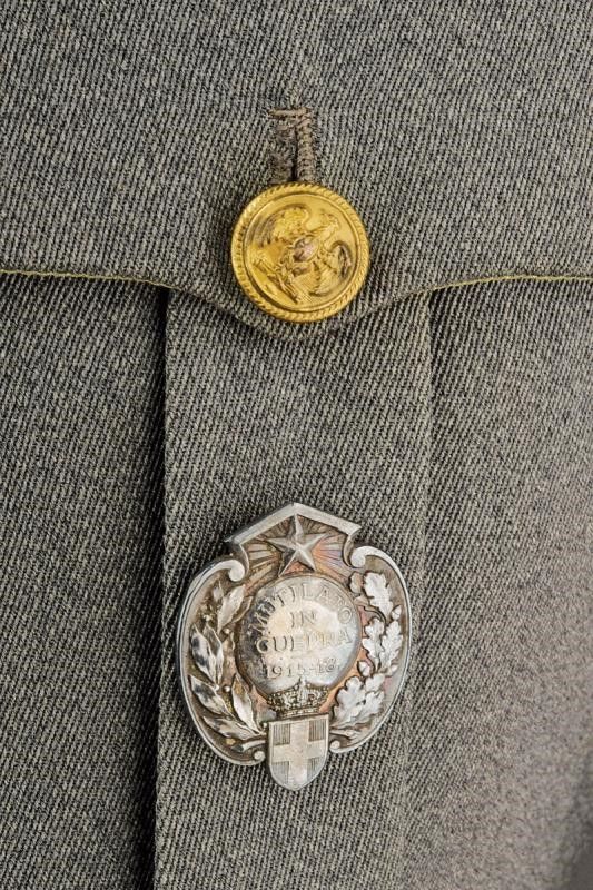 Regno d'Italia, altezza 78 cm. 1940 circa In tessuto grigioverde, con mostrine e profilature nere, completa di tutti gli effetti in canutiglia dorata o argentata. Il petto con vari nastri e decorazioni, fa le quali tre promozioni per merito di guerra, due medaglie d'oro, due medaglie d'argento e fregio per mutilati in guerra (1915-18). All'interno etichetta dell'Unione militare e evidenti segni d'uso.