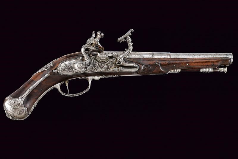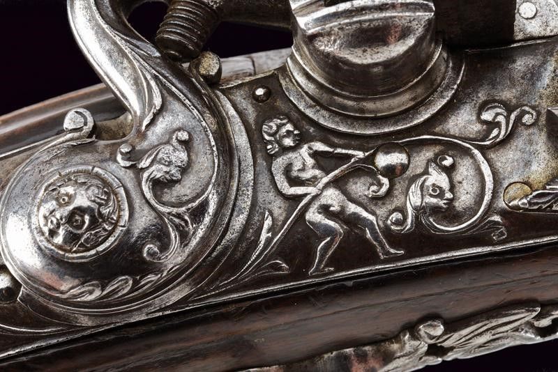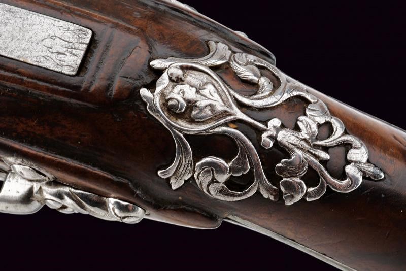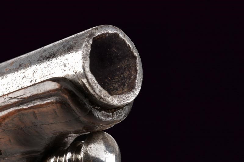 Italia settentrionale, lunghezza 36 cm. XVIII Secolo Canna liscia a quattro ordini: il primo segmento ottagonale con resti di marcatura 'LAZARO LAZARINO', il secondo faccettato, gli ultimi due tondi inframezzati da anellature. In volata cal. 12,4 mm. Interessante l'anima di sezione poligonale (a esagono) i principi incavati sugli angoli dell'esagono, forse con un lievissimo andamento elicoidale. Batteria di elegante fattura con cartella leggermente tondeggiante recante un fregio a racemi sorretto al centro da un putto. Codolo e vite del cane con mascherone in rilievo. Collo della martellina a protome muliebre grottesca. Meccanica funzionante a singolo scatto. Tipico copriscodellino a scorrimento. Cassa in legno con delineature e fogliame sul lato inferiore. Piccolo tassello restaurato nella scanalatura per la bacchetta. Fornimenti in ferro. Coccia e ponticello con bei mascheroni in rilievo. Scudetto dorsale con ritratto di dama entro una cornice a cuore e con fiorami traforati attorno. Traforata anche la contropiastra, dotata inoltre di gancio da cintura. Bacchetta in legno con battipalla in ferro tornito e cavastracci.