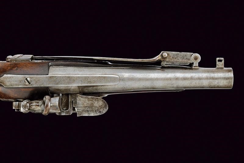 Spagna, lunghezza total open 38,5 cm. XVIII Secolo Canna tonda liscia con tre bindelle nella prima metà, una dorsale, due ai fianchi, cal. 15,5 mm. Batteria a pietra con meccanica funzionante. Cartella piatta a margini ribassati. Cassa lunga in legno. Fornimenti in ferro. Semplice bacchetta in legno sostituita. Sul fianco sinistro è montata una baionetta pieghevole, con apertura a scatto e cursore di blocco/sblocco alla contropiastra.