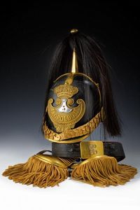 Regno d'Italia, altezza 29 cm. 1910 circa Il copricapo con corpo rivestito in panno nero (buchi da tarme) completo [..]
