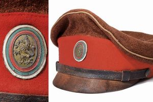 Bulgaria, altezza 14 cm. 1914-18 In panno color ruggine con fascia rossa e visiera in pelle. Sulla fronte medaglione [..]