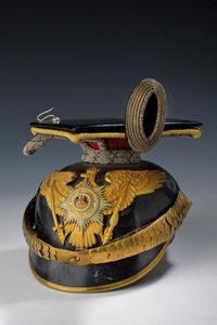 Prussia, altezza 16 cm. 1900 circa Corpo in cuoio laccato di nero, aquila dorata con stella dell'Aquila Nera in [..]