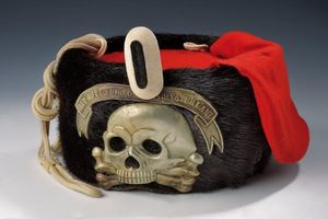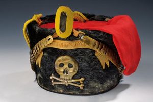 Regno d'Italia, altezza 15 cm. 1880 circa In pelliccia nera con imperiale in cuoio, cordellina intrecciata, fregio [..]