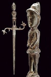 Italia, lunghezza 31.5 cm. XVII Secolo Lama dritta a sezione di losanga, nodo a sfera. Elso in ferro con corti [..]
