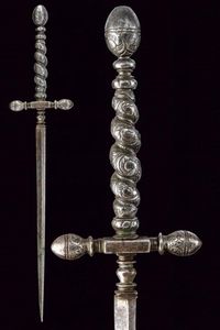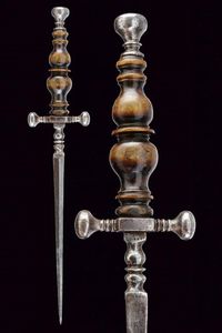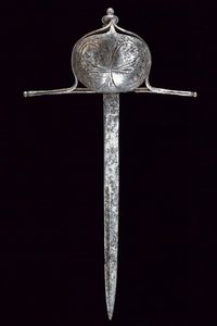 Italia, lunghezza 31.8 cm. 1640 circa Lama dritta appuntita, di sezione triangolare, con nodo intagliato a balaustro. [..]
