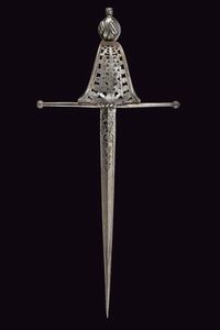 Italia, lunghezza 28.6 cm. 1640 circa Lama dritta di sezione triangolare, decorata alla base con un disegno a [..]