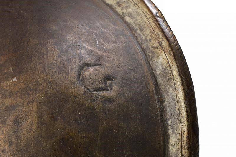 Granducato di Toscana, altezza 28 cm. primo quarto del XVII Sec. Coppo realizzato in due pezzi, con bassa cresta lavorata a fingere il tortiglione, nasale rivettato. Breve tesa spiovente con punzone poco leggibile e nella parte interna croce dell'ordine di Santo Stefano; il bordo della tesa orlato e lavorato a fingere il tortiglione, come anche gli orecchioni e lama di gronda. Due orecchioni mobili con trafori a rosetta per areazione e altri per la fodera, due passanti per la cinghia di chiusura, agli angoli un rivetto moderno con resti di cuoio. Due lame di gronda. Tutti gli elementi decorati con doppie linee ai bordi. Alcuni dei rivetti interni mostrano ancora lievi resti della fodera. In generale piccole mancanze, uno degli orecchioni con restauro. Sui due emisferi del coppo sono incise le lettere 'GP', a testimonianza dell'utilizzo di questo elmo nel celebre Gioco del Ponte.