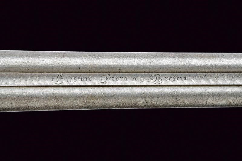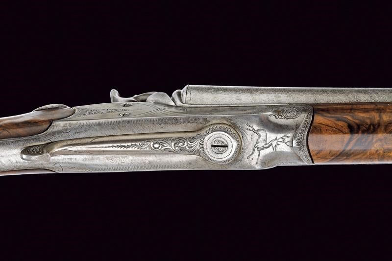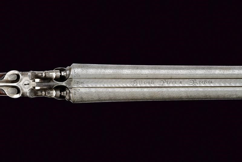 Brescia, lunghezza 119,3 cm. 1875 - 1889 circa Canne tonde lisce, in damasco, con bindella firmata 'Glisenti Pieri a Brescia', piccole incisioni in culatta. Anime in buono stato con minimi segni del tempo. Cal. 16. La bascula con interessante e raro sistema a due grilletti posti sul dorso del collo e con due cani. Meccaniche ben funzionanti. La superficie incisa con effigi di animali quali una lepre e un cervo e a racemi. Sul lato inferiore la lunga chiave di apertura. Calcio ed astina in radica. Fornimenti in ferro.