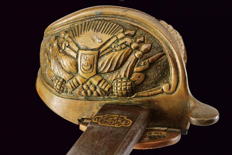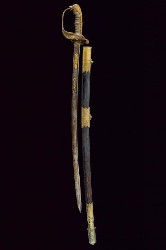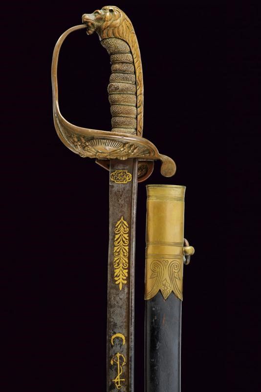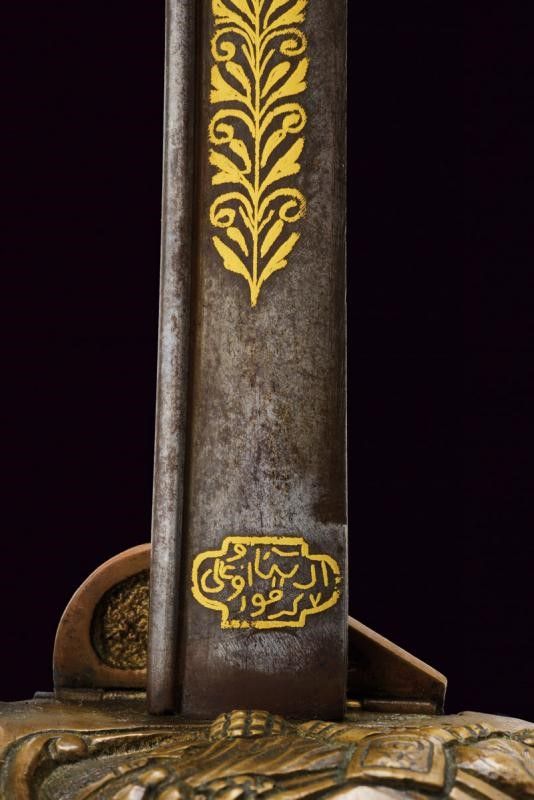 Turchia, lunghezza 86 cm. Fine del XIX Secolo Lama leggermente curva con jelman, recante alla base un cartiglio con iscrizioni in arabo rimesse in oro, decorazioni ed un'ancora fra stelle e luna. Sul lato opposto decorazione sempre in oro. Fornimento in bronzo con trofeo sulla valva, pomo a testa di leone con cappetta lunga, impugnatura in legno rivestita di pelle di pesce e con trecciola metallica. Fodero in cuoio con fornimenti in ottone inciso, vela in ferro e due anelli di sospensione.