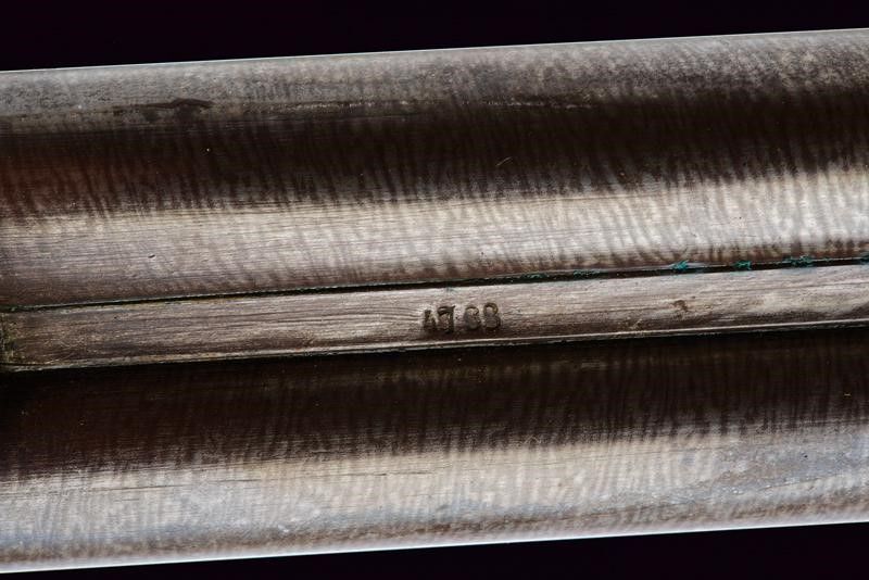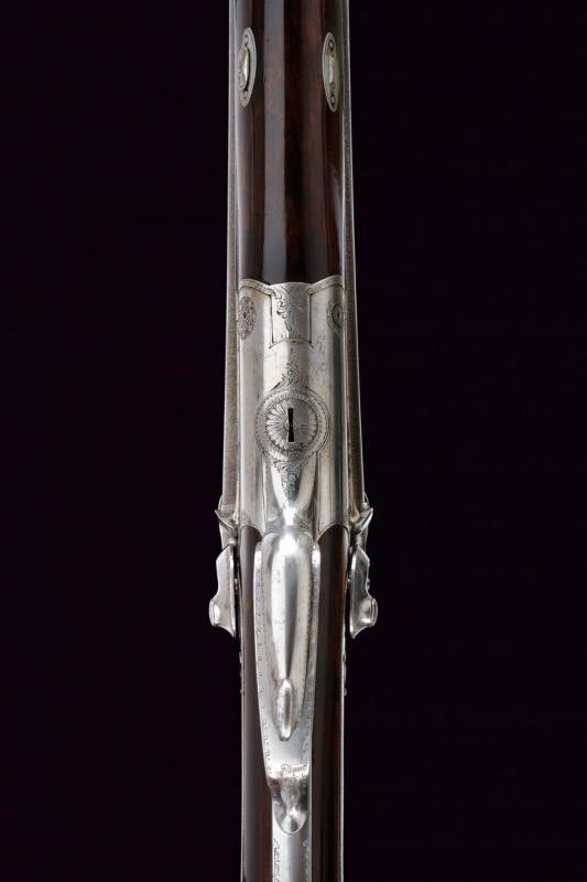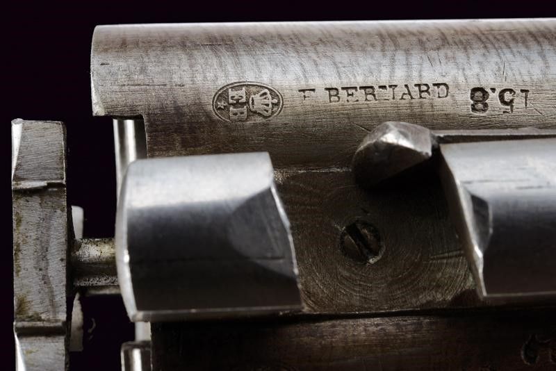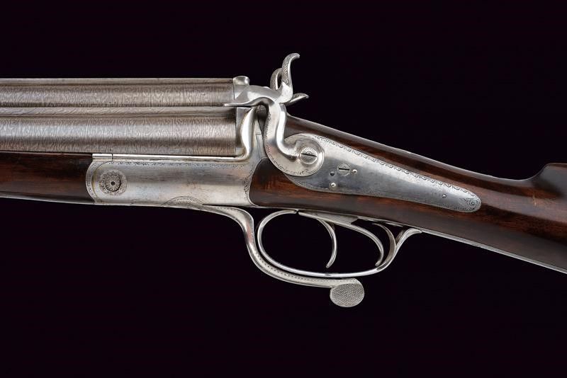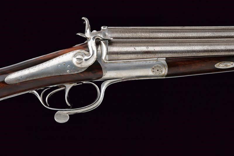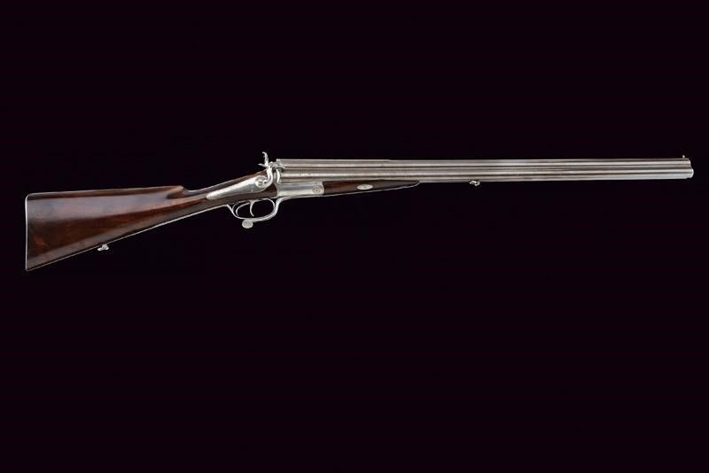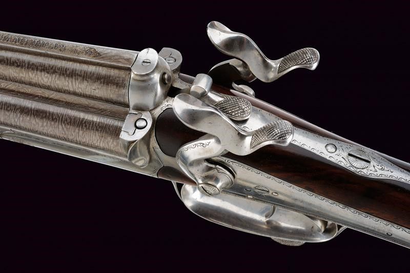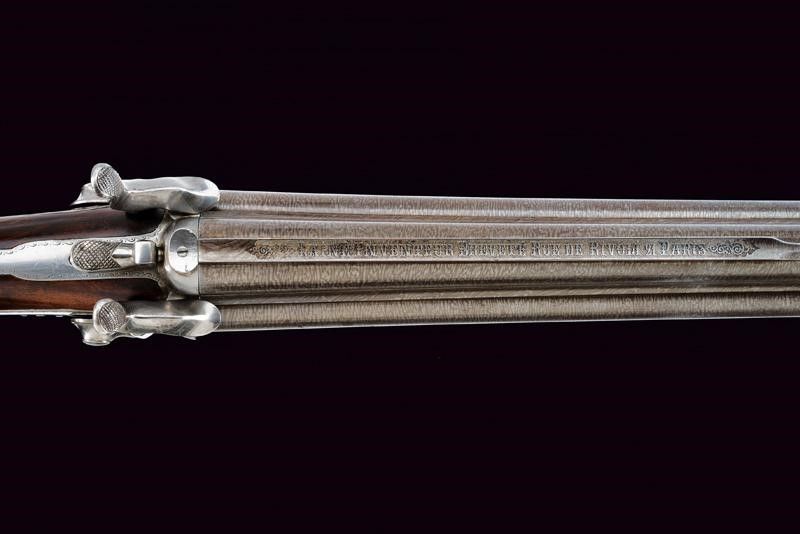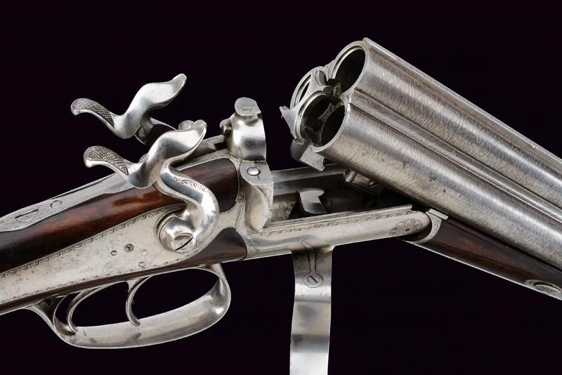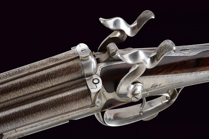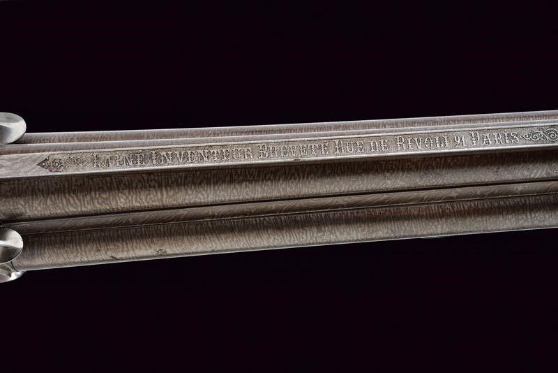 Parigi, lunghezza 112 cm. 1880 circa Gruppo di tre canne tonde, lisce (con leggero pitting), in damasco, brunite, quella superiore dotata di bindella avente la prima parte allargata e leggermente convessa, questa reca l'iscrizione 'LAINE' INVENTOIR BREVETE' RUE DE RIVOLI 21 PARIS'. Il mirino in ottone, cal. 16 mm in volata (inferiore a 16 gauge); codetta incisa. Batterie a molla indietro con incisione ai bordi; due cani laterali e uno centrale. Chiave con leva d'apertura davanti al ponticello. Calcio ed astina in legno liscio. Fornimenti in acciaio decorati en suite. Il grilletto anteriore aziona in sequenza i cani laterali, quello posteriore aziona il piccolo cane della canna superiore.