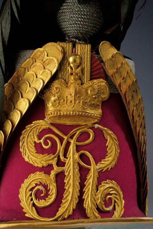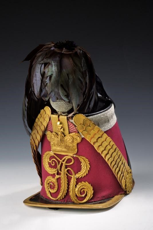 Regno delle Due Sicilie, altezza 27 cm. Prima metà del XIX Secolo Alto fusto rivestito di panno cremisi, con gallone bianco, fornimenti in ottone dorati al mercurio, soggoli a squame con rosoni a testa di medusa, nappina composita in canutiglia d'argento, dotata di piume. Interno in marocchino. Cuffia in carta bianca (di epoca successiva?).