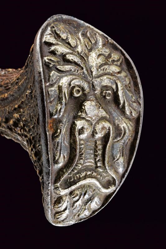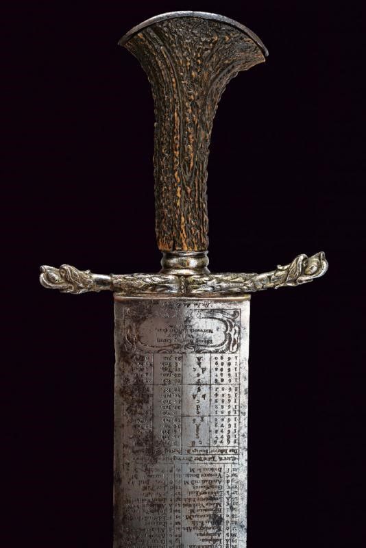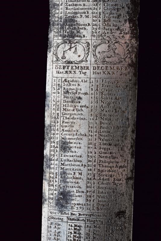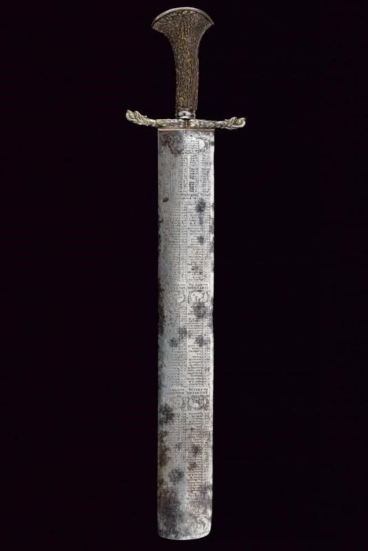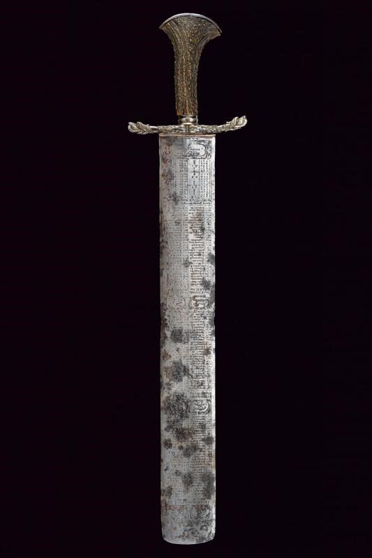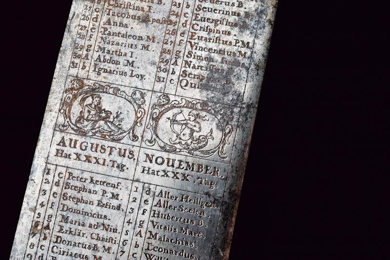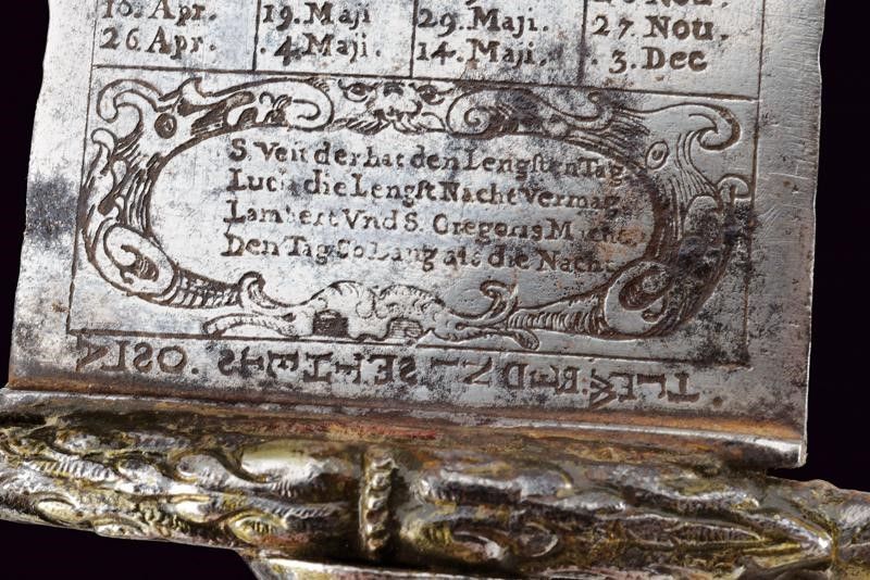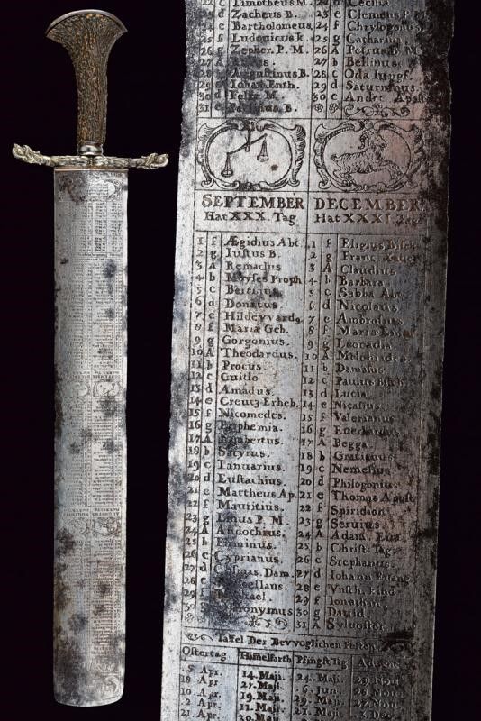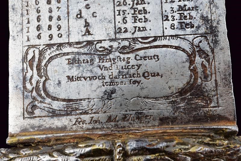 1675 - 1676 Larga lama dritta a due fili con tonda arrotondata, tutta incisa all'acquaforte con un calendario ciclico (effemeridi) che consente di stabilire le date degli onomastici mobili in un qualsiasi anno dal 1676 al 1690, nonché il segno zodiacale regnante; su una faccia alla base, in caratteri minuscoli, è incisa la legenda 'ALSO STEHT ES IN DER WELT' (Ecco come stanno le cose in questo mondo), sull'altra faccia 'Fec. Ioh. Ad. Ehinger'. Alla punta su entrambi i lati è inciso un mascherone, tra i mesi si trovano bellissime effigi dei segni zodiacali. La superficie presenta zone di corrosione. Fornimento in ferro con bracci dell'elso leggermente incurvati verso l'alto, culminanti a testa di segugio a tuttotondo; il massello intagliato a fiorame. Il pomo profondamente intagliato, con una maschera grottesca. Impugnatura in corno di cervo. Interessante squarciatoio che unisce elementi mistici, astrologici e religiosi con l'arte della venatoria.
