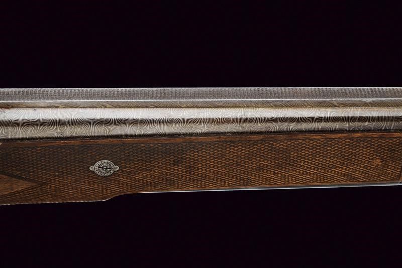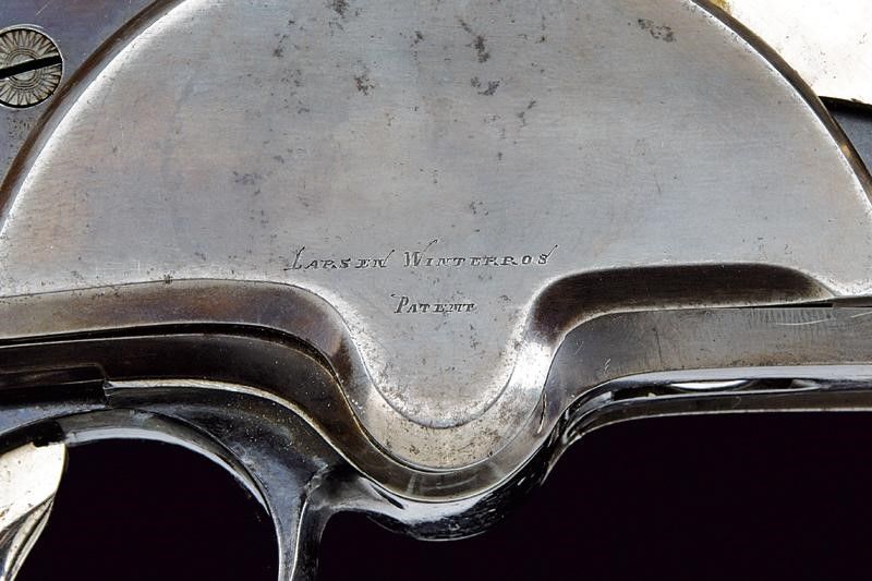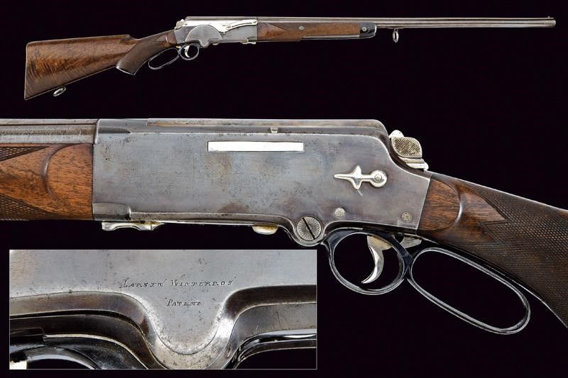 Belgio, lunghezza 122 cm. 1885 circa Canna tonda liscia con bindella dorsale zigrinata e mirino in metallo bianco. Bella finitura in damasco. cal. 12. Castello con marcatura del brevetto 'LARSEN WINTERROS PATENT'. Meccanica di caricamento a leva con otturatore a scorrimento longitudinale e serbatoio tubulare nascosto nell'astina. Punzone di collaudo di Liegi e marchio dell'ispettore. Calcio ed astina in noce, entrambi finemente zigrinati. Le parti metalliche con buona parte della brunitura antica. La leva d'armamento in blu, le altre componenti funzionali lucidate color acciaio. Coccia e elemento finale dell'astina in ebano o corno bruno. Meccanica ben funzionante.