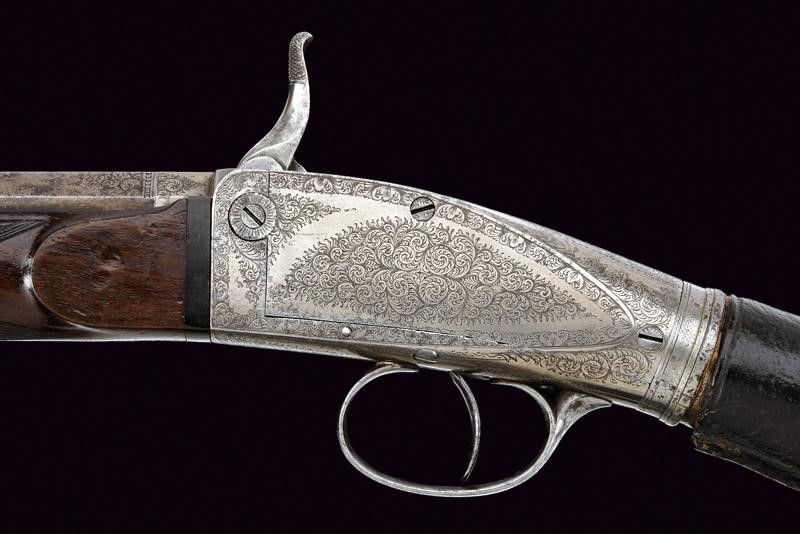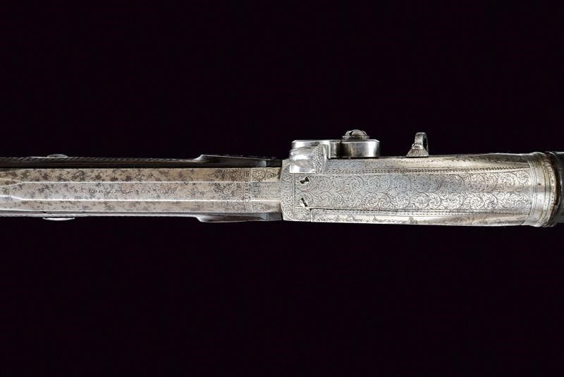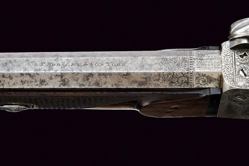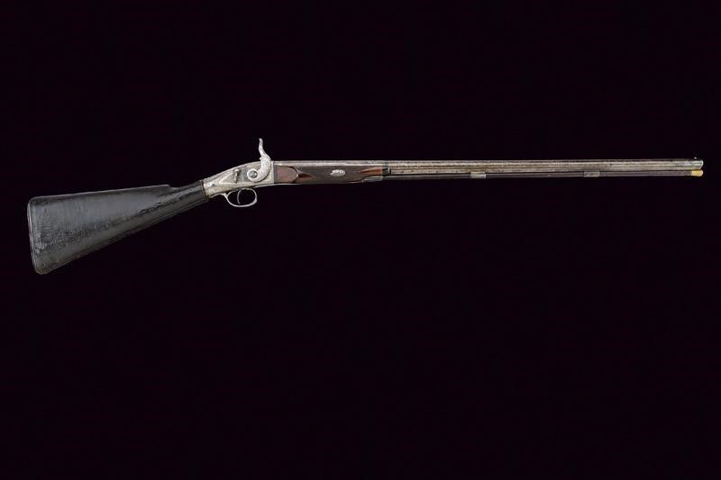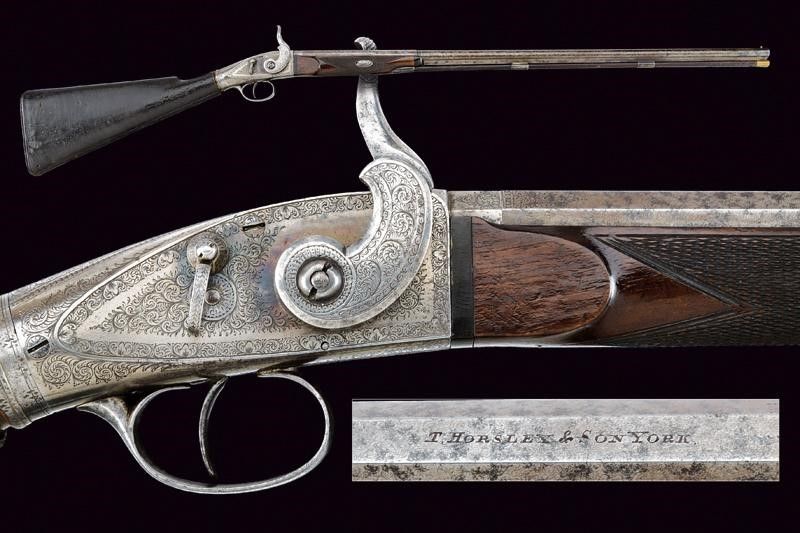 Metà del XIX Secolo Canna liscia a tre ordini, prima ottagonale ed incisa alla base, in seguito recante la firma 'T. HORSLEY & SONS YORK', poi con un segmento a sedici facce e anellature al cambio, infine di sezione tonda, dotata di mirino, in calibro 11 mm. Il castello in ferro finemente inciso a motivi floreali, munito di sicura e cane. Corta astina in legno zigrinato con muso in corno; calcio svitabile con serbatoio per l'aria, rivestito di cuoio. Bacchetta in legno con battipalla e cavastracci in ottone.