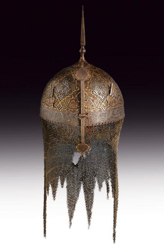 Indopersia, altezza ca. 58 cm. XIX Secolo Calotta emisferica in ferro, alla sommità cuspide di sezione romboidale su nodo e base troncoconica, protezione del naso scorrevole e due pennacchiere laterali; la superficie riccamente incisa, intagliata, traforata e parzialmente decorata a motivi floreali, il bordo con cartigli recanti scritte in caratteri arabi e resti di argentatura. Completo di camaglio a frange (mancanze) formato da piccoli anelli a chiusura semplice e con decorazioni a bande di anelli in ottone. All'interno resti della fodera originale.