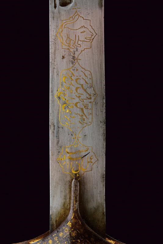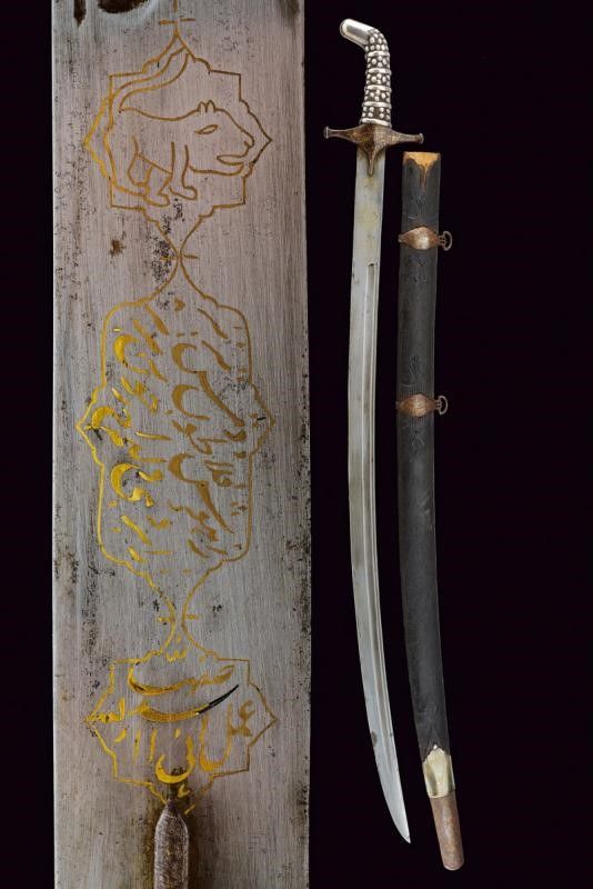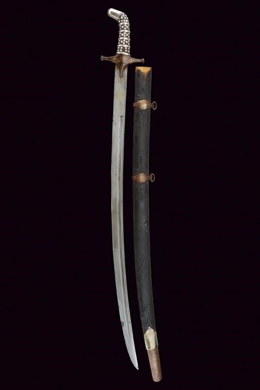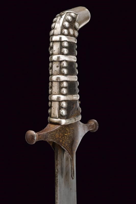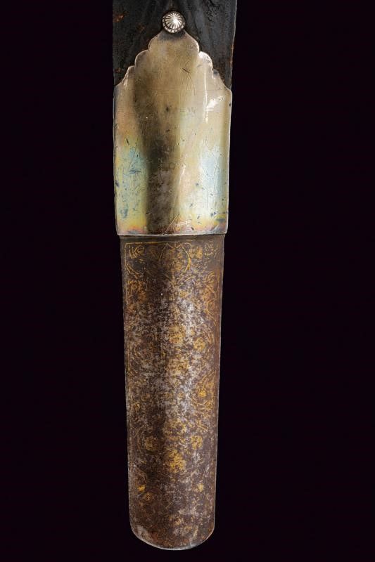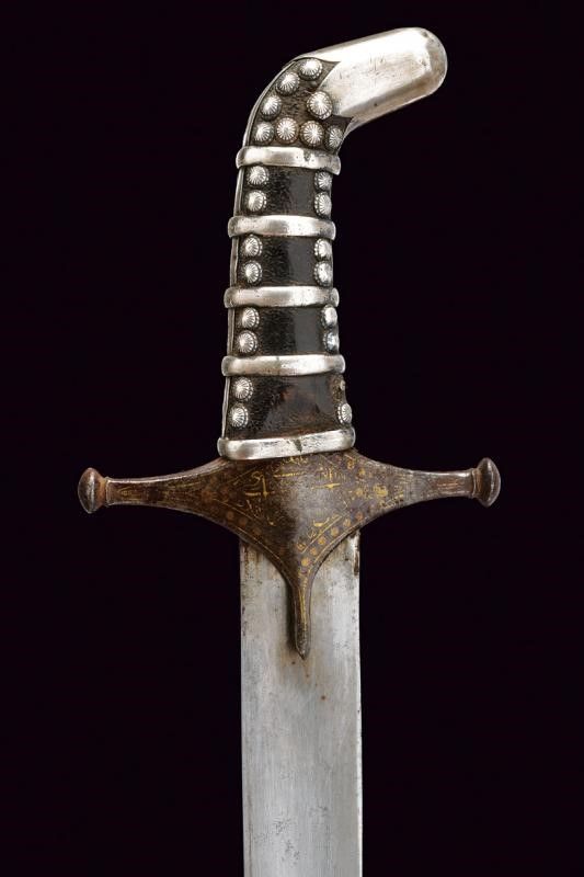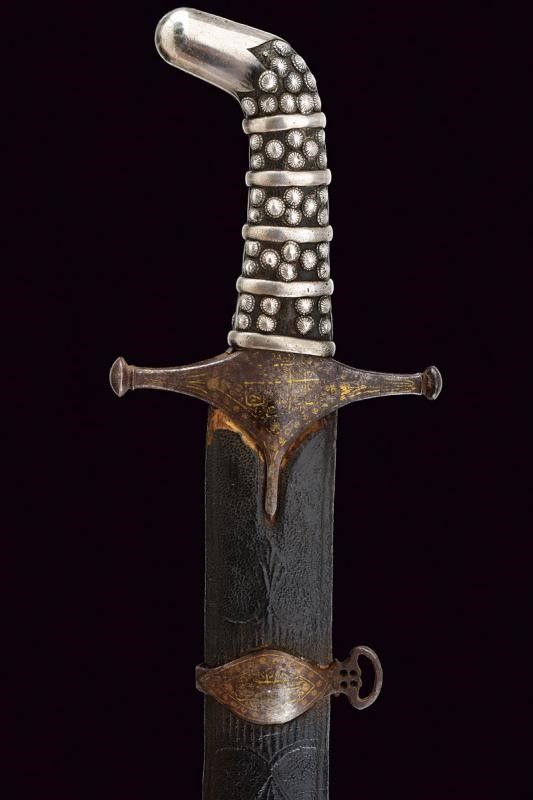Georgia, lunghezza 96.5 cm. XVIII Secolo Lama leggermente curva a un filo e breve controfilo, in damasco (piccole zone con danni da ruggine), con sgusciatura e scanalatura dorsale; sul lato di terza tre cartigli con iscrizioni in caratteri arabi rimessi in oro (piccole mancanze). Fornimento con elso in ferro, alette fermafodero, bracci dell'elso terminati con dischi convessi e decorati in oro. Impugnatura in legno rivestita di cuoio con pomo angolato, decorata con bande, rivetti a raggi e cappa liscia in argento. Fodero in legno rivestito di cuoio decorato in rilievo (mancanze), fornimenti in ferro decorati en suite con l'elso; sopra al puntale un fornimento in argento rivettato come l'impugnatura.