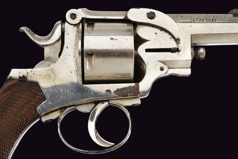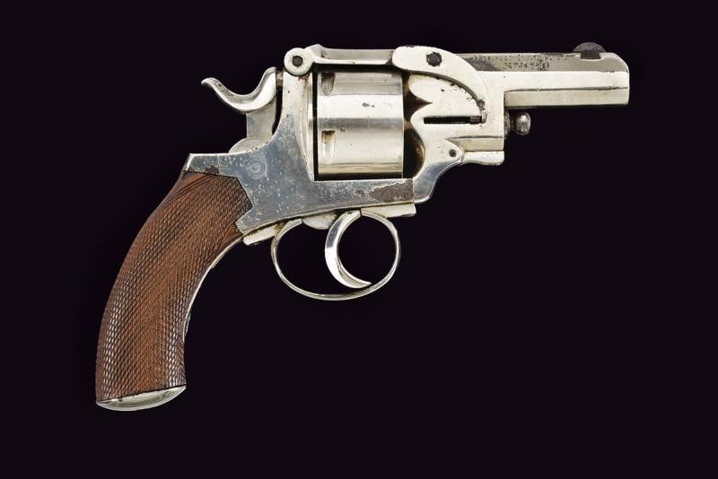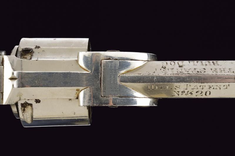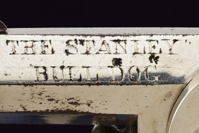 Inghilterra, lunghezza 22.5 cm. 1880 circa Canna rigata, ottagonale, marcata sul fianco destro 'HILL'S PATENT No. 320' e 'THE STANLEY BULL DOG', dotata di mirino, cal. 11 mm. Tamburo liscio a cinque colpi con punzoni del banco di prova di Birmingham; castello con Trade Mark, pulsante d'apertura dell'arma sotto alla canna (che ruota sul cardine posto sopra al tamburo); impugnatura in legno zigrinato. Conserva il 95% della nichelatura originale.