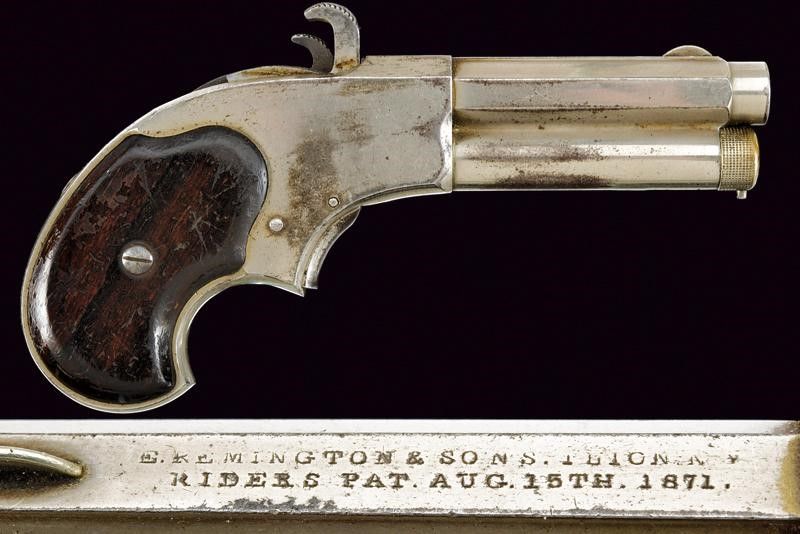 1871 - 1888 Canna ottagonale, rigata (anima pulita, rigatura visibile), con volata circolare, recante marcatura della ditta e brevetto Rider del 1871, cal. 32 rimfire extra-short, Nella parte inferiore il serbatoio tubolare estraibile con tappo in ottone zigrinato. Castello in ferro in un unico pezzo con l'impugnatura, leve di caricamento dorsali. Meccanica da rivedere (il cane non sta in monta). Impugnatura con guancette lisce in legno. Conserva il 60% circa di nichelatura antica. Cane con resti di brunitura color blu.