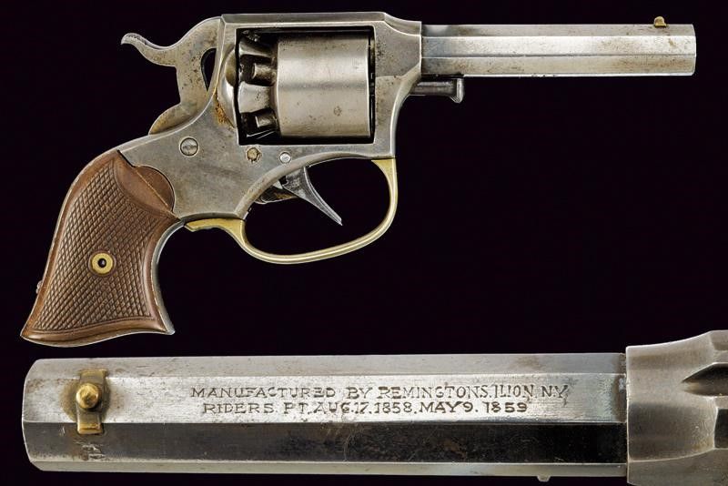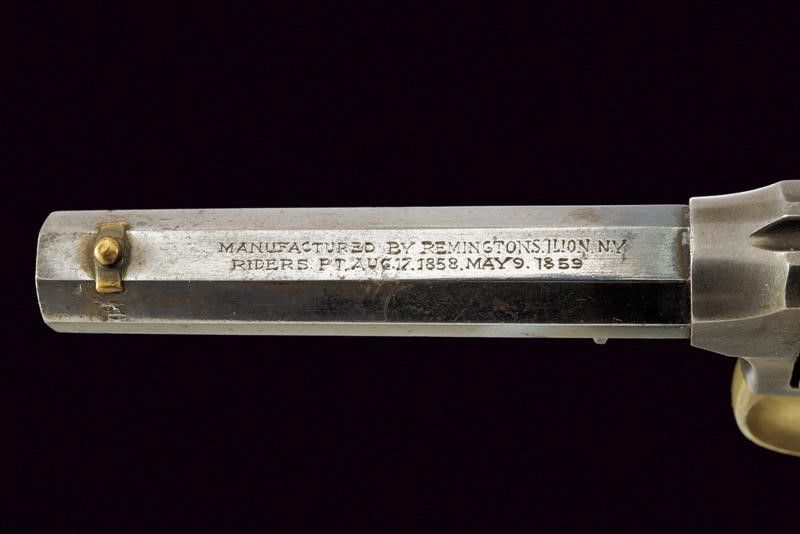 USA, lunghezza 17.1 cm. 1860 - 1873 Canna ottagonale, rigata (qualche segno d'uso, rigatura visibile), con mirino conico, marcatura standard in due righe, cal. 31. Tamburo liscio a cinque colpi. Castello liscio, grande ponticello in metallo color argento. Matr. '26xx' vicino al grilletto e '4xx' al di sotto della canna. Guancette in gommadura zigrinata (restauri e mancanze). Meccanica funzionante. Raro.