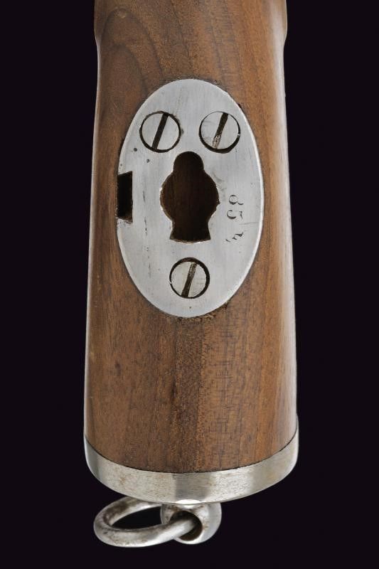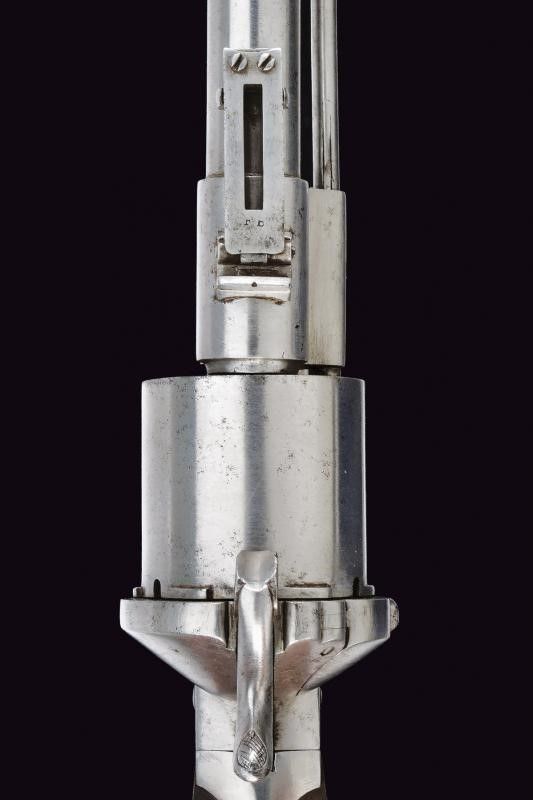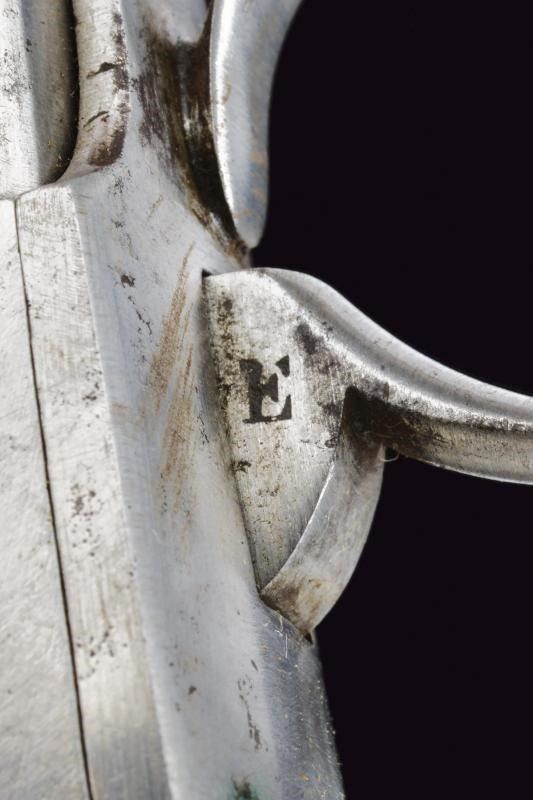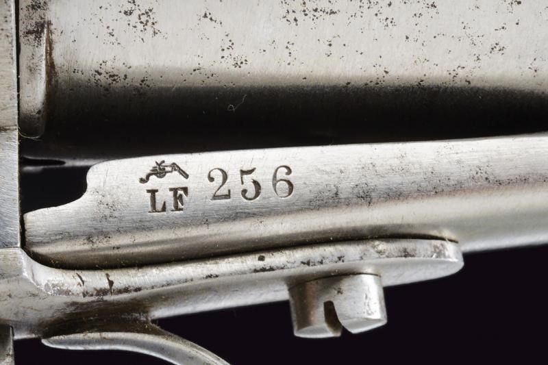 Francia, lunghezza 30.5 cm. 1870 circa Canna tonda rigata con base ingrossata recante un alzo regolabile e abbattibile, mirino, cal. 10 mm; tamburo liscio a sei colpi. Castello con matricola 'LF 25x'. Sportellino di caricamento, estrattore e ponticello con poggiadito. Calcio in legno. Anello di sospensione. Sforatura per innesto di un calcio smontabile (non presente).