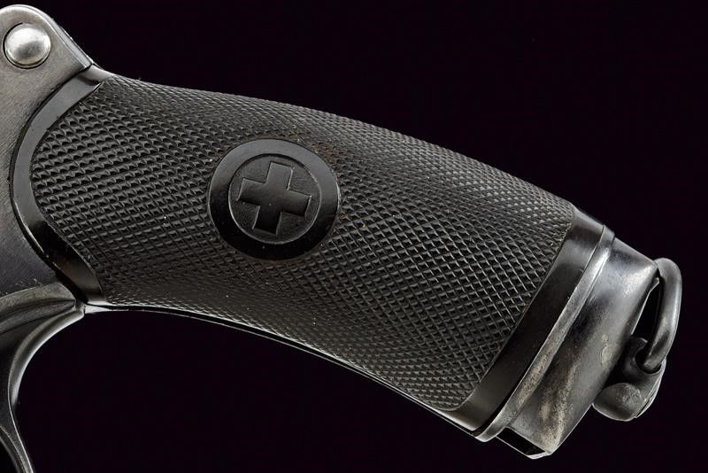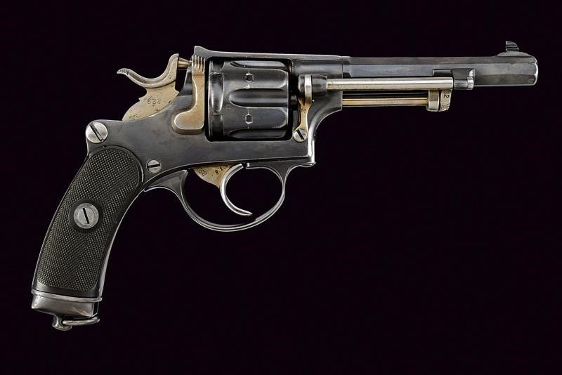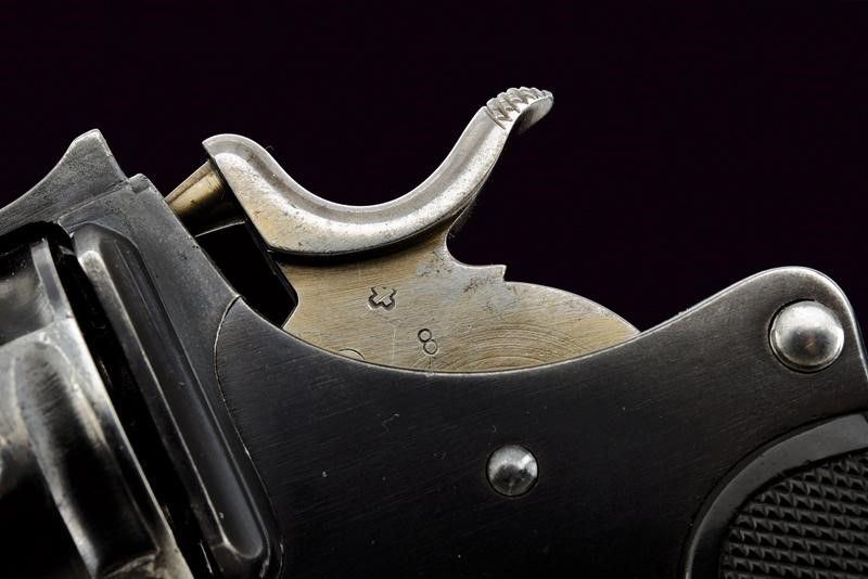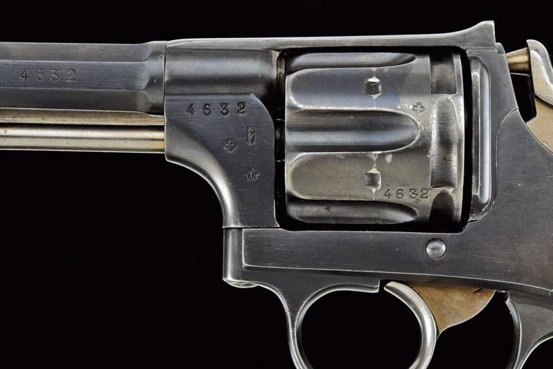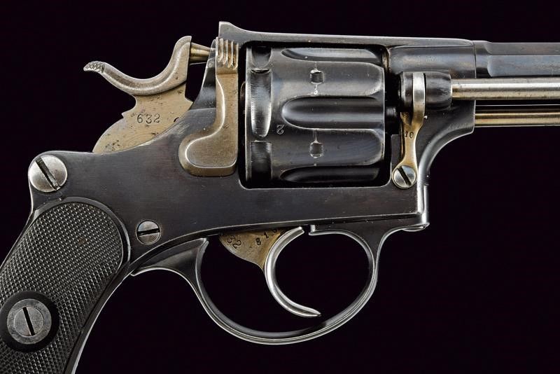 Svizzera, lunghezza 23,3 cm. 1882 Canna ottagonale, rigata. Cal. 7,5 mm. Vari punzoni elvetici sul lato sinistro. Tamburo a sei colpi. Meccanica ben funzionante. Brunitura antica presente all'85%. Guancette in gommadura zigrinata con croce elvetica al centro. Anello porta correggiolo.