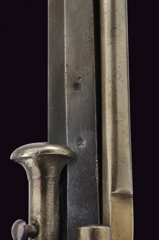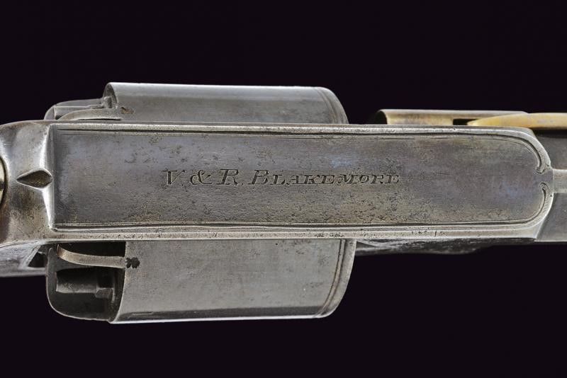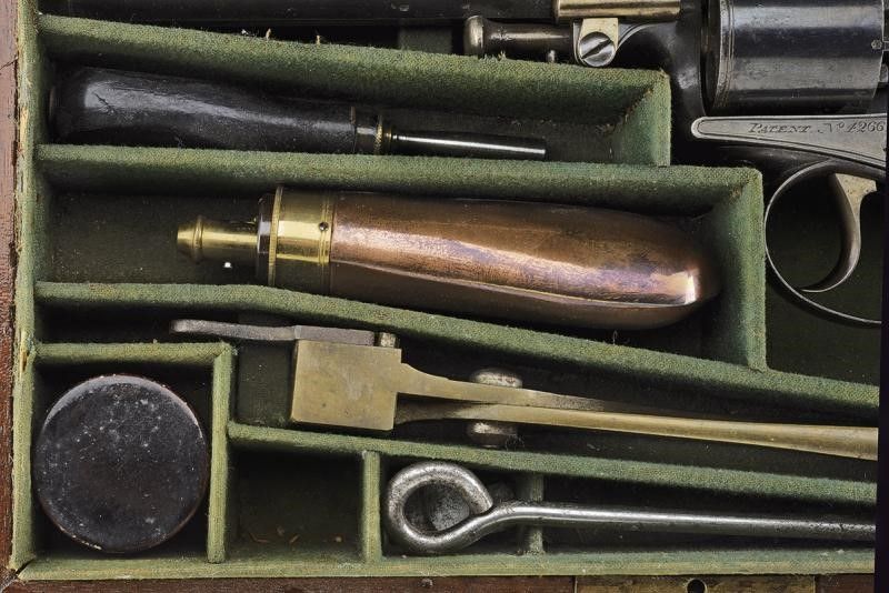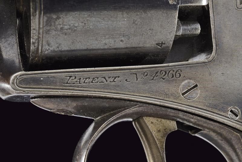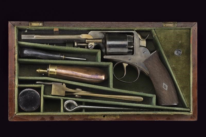 Inghilterra, lunghezza 31.5 cm. Metà del XIX Secolo Canna rigata ottagonale e dotata di mirino, con punzone del banco di prova di Birmingham, cal 11 mm. Tamburo liscio a cinque colpi con punzoni e camere numerate. Castello marcato 'PATENT N.o 42xx', i bordi delineati. Guancette in legno zigrinato. Il revolver conserva il 95% della brunitura originale. Nella sua cassetta di legno, l'interno rivesto in panno verde; completa di attrezzi e chiave.