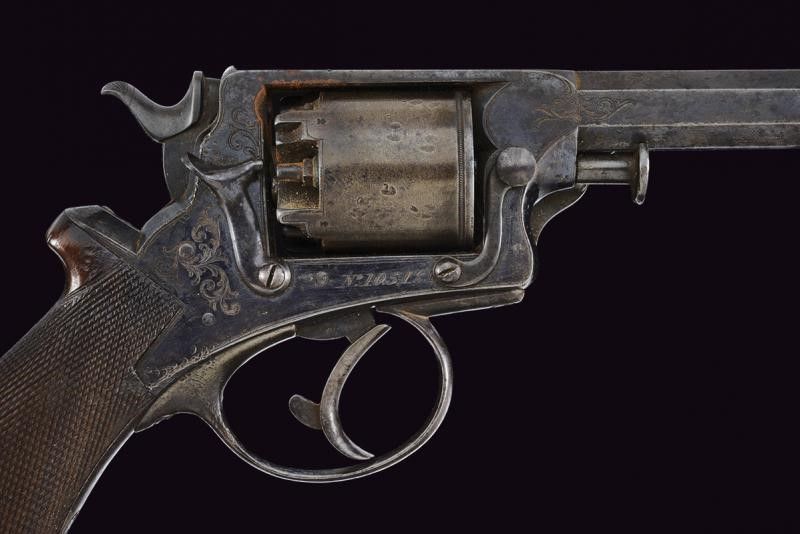 1855 circa Canna rigata, ottagonale, con mirino, incisa alla volata, cal. 11 mm. Tamburo liscio a cinque colpi con bordi delineati e punzoni del banco di prova. Castello marcato 'TRANTER'S PATENT', 'HH' e 'No. 10512T', delineato ai bordi. Calcatoio marcato en suite e sicura. Calcio in legno zigrinato. Brunito. Meccanica ferma, necessita revisione. Nella sua cassetta di legno foderata all'interno in velluto blu, completa di tutti gli attrezzi, con fiaschetta foderata in cuoio, nel piccolo scomparto interno un dosatore, un porta capsule ed altro. La chiave mancante.