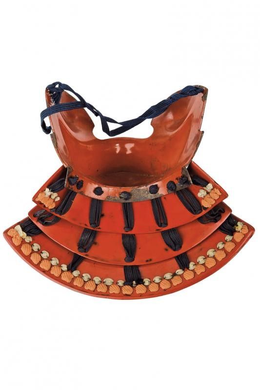 Giappone, altezza 23 cm. Periodo Edo (1603-1867) In ferro color ruggine, guance tondeggianti, taglienti e con Odayori-no-ita. Mento rialzato. All'interno laccato di rosso (piccole mancanze). Yodarekake (realizzato in seguito) a tre grandi piastre di ferro con medesima lavorazione color ruggine. Sugake blu. Hishinui arancione e Uname bianco sulla prima e sull'ultima piastra. XVIII secolo.