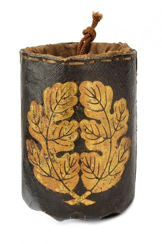 Giappone, altezza 18 cm. Periodo Edo (1603-1867) In cuoio laccato color verde scuro con Mon in oro, la parte superiore con tessuto e chiusura munita di un netsuke. Utilizzata per alimentare i falchi. Rara.