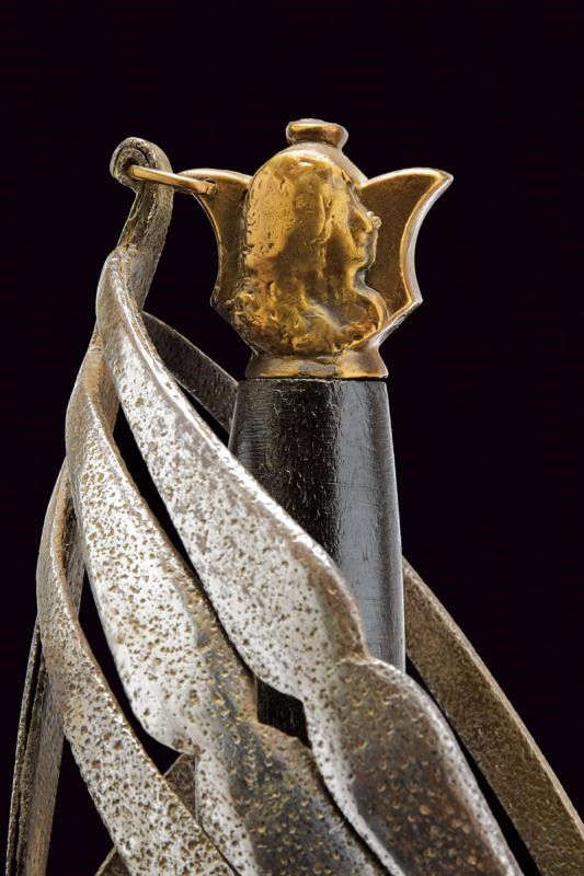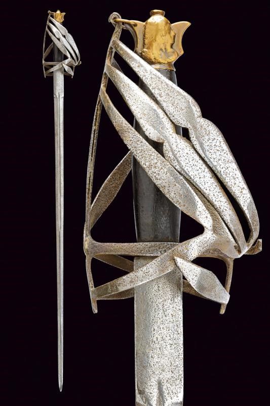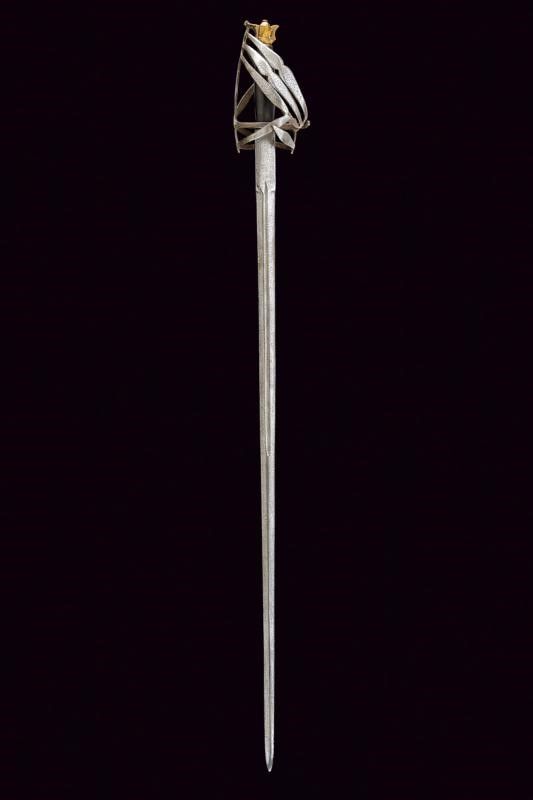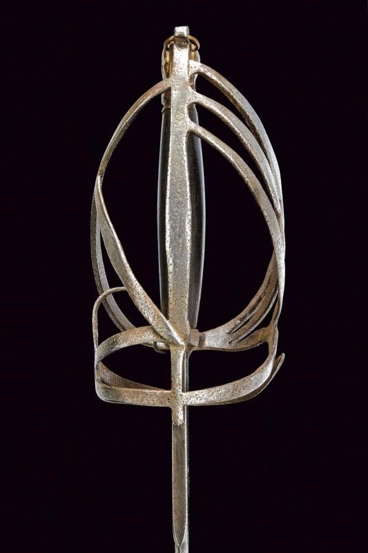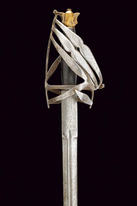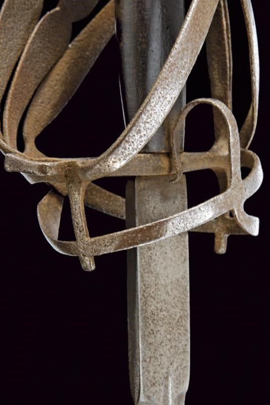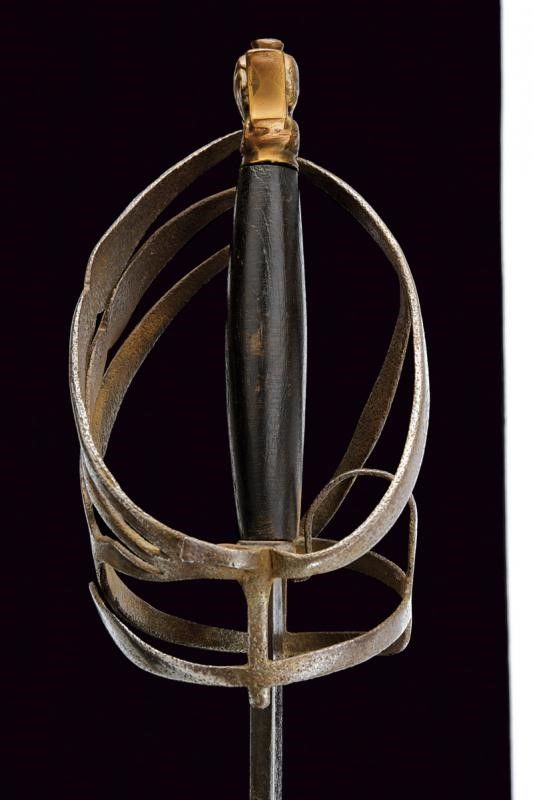 Italia, lunghezza 121.5 cm. XIX Secolo Lama dritta a due fili di sezione lenticolare,con scanalatura centrale nella prima parte e con lungo tallone. Fornimento in ferro a gabbia con anello da pollice. Pomo a testa di gatto con busto in rilievo. Impugnatura in legno.