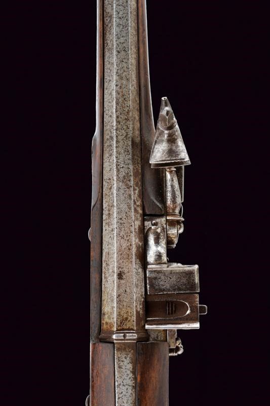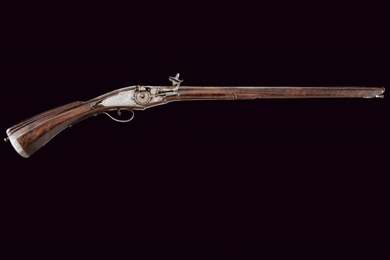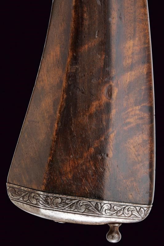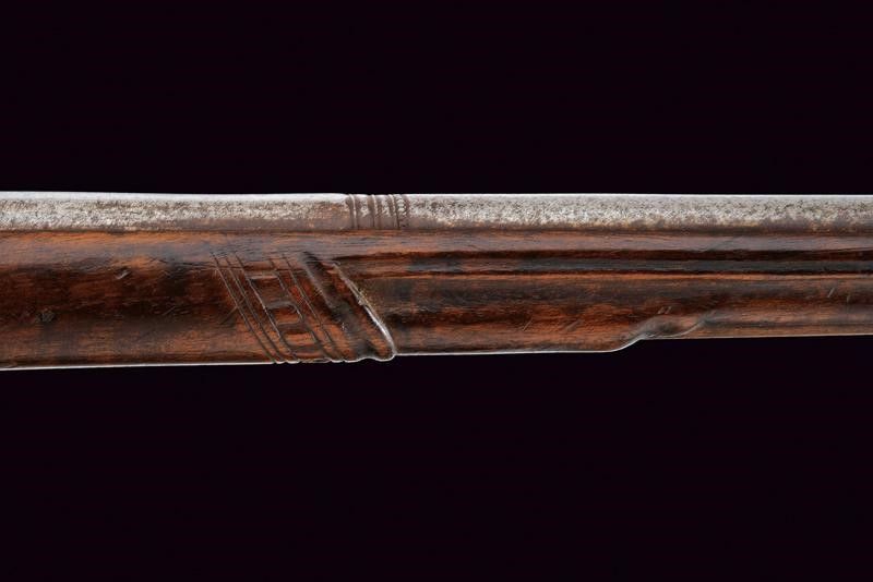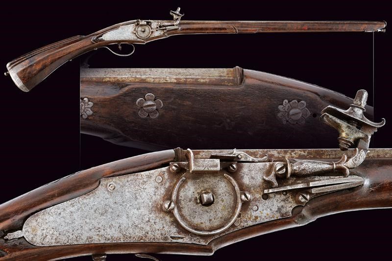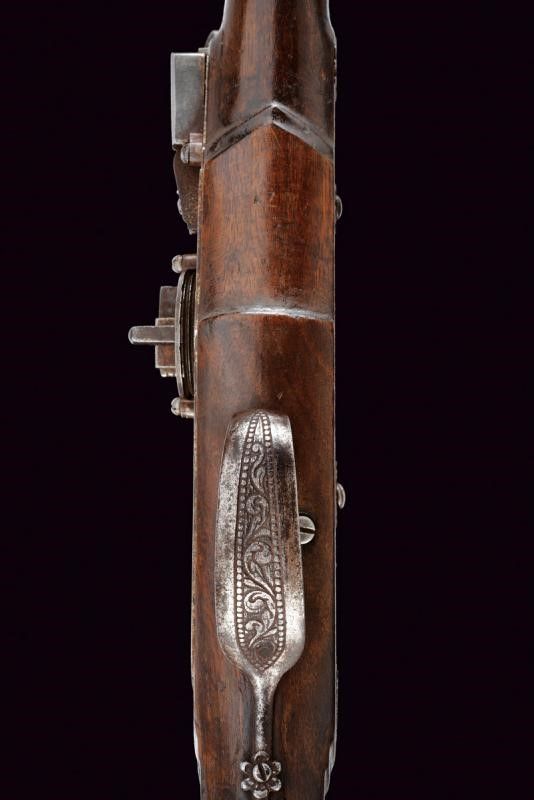 XVII Secolo Canna liscia a due ordini, prima ottagonale con cornice alla base recante l'alzo, dopo due anellature lisce e una perlinata diviene di sezione tonda, con gioia di bocca in volata, 14 mm. Batteria a ruota esterna e cartella piatta, il cane leggermente intagliato a motivi floreali, copriscodellino scorrevole. Cassa intera in legno, leggermente scolpita con scanalature sotto alla canna e sulla parte destra del calcio, quest'ultimo faccettato. Fornimenti in ferro incisi con bande a fiorame. Gancio da cintura mancante. Bacchetta in legno con battipalla in ferro inciso.