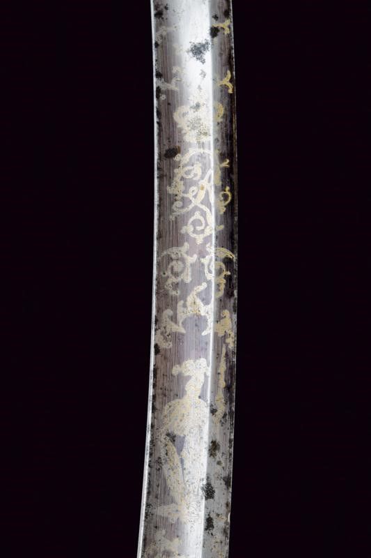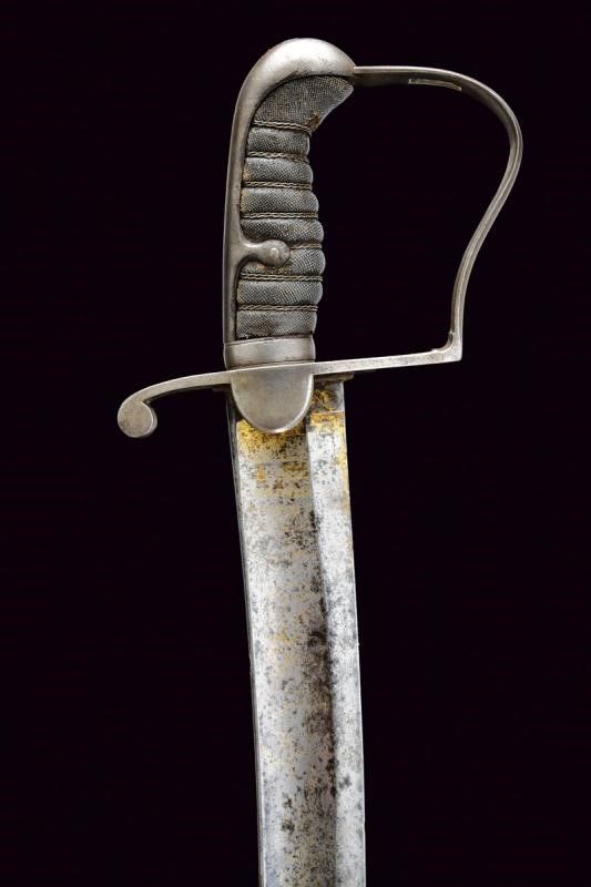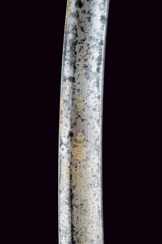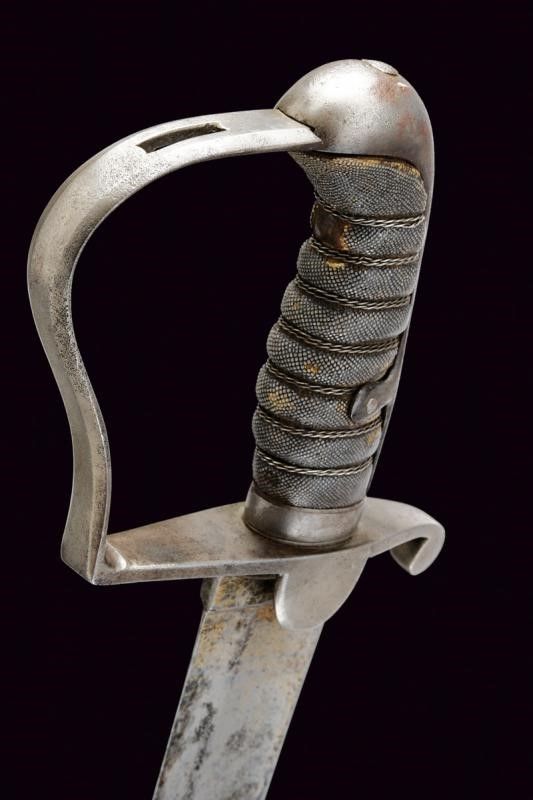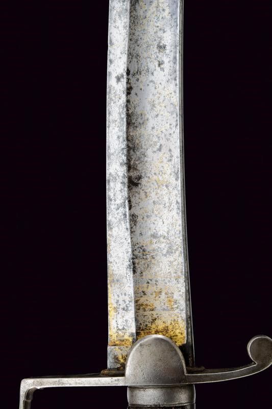 Inghilterra, lunghezza 95.5 cm. 1800 circa Larga lama curva a un filo e controfilo con ampio sguscio centrale, con resti di incisioni dorate su fondo blu alla base, monogramma regio 'GR' sotto corona, trofei e decorazioni floreali su un lato, e resti dello stemma reale e motto 'DIEU MON DROIT'; firma dell'armaiolo poco leggibile. Fornimento monoelso in acciaio con alette fermafodero, cappetta lunga e ghiera liscia, impugnatura rivestita di pelle di pesce e con trecciola in filo di ferro; completa di fodero a due anelli di sospensione.