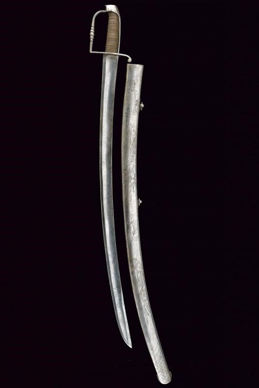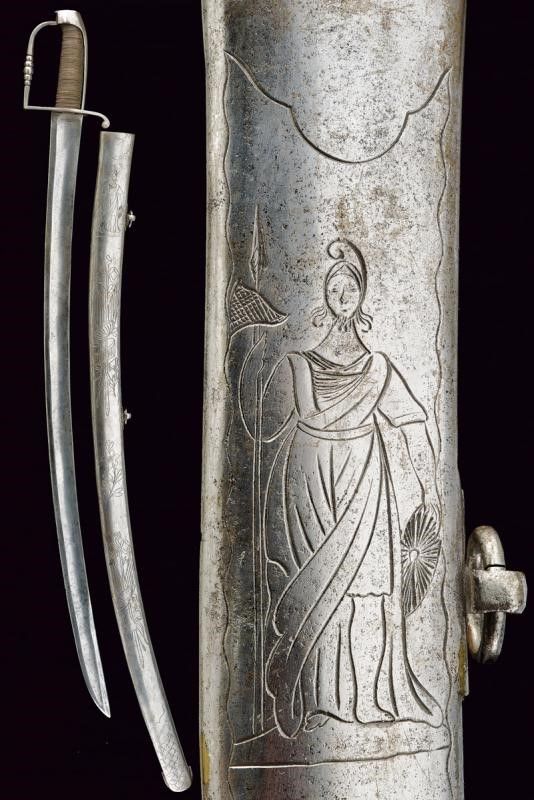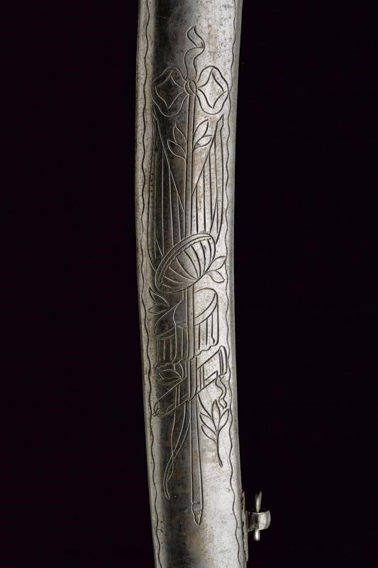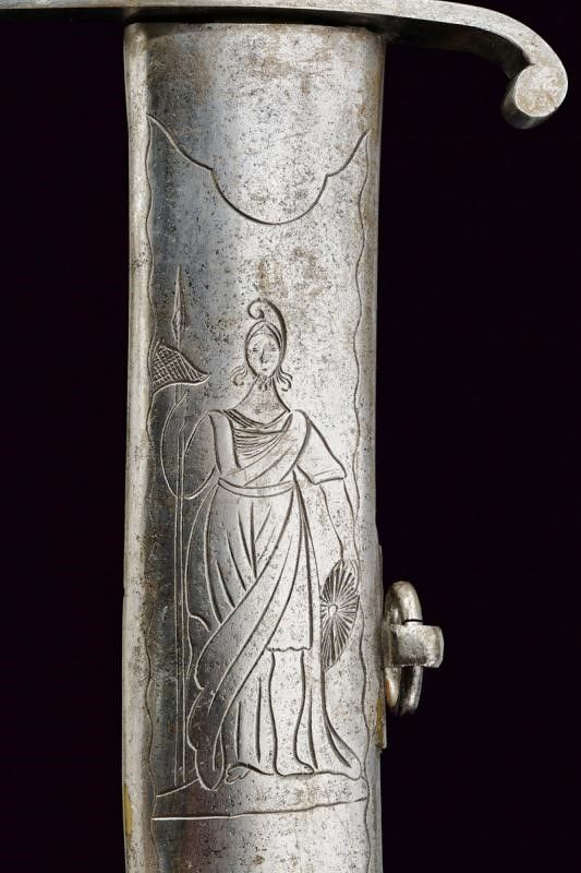 Regno Italico, lunghezza 99.5 cm. 1810 circa Larga lama curva a un filo e controfilo con ampio sguscio e tallone. Fornimento monoelso a staffa, la guardia con cinque sfere. Cappetta lunga, liscia e faccettata. Impugnatura in legno con trecciola metallica. Fodero in ferro, la parte anteriore incisa con effige di Atena, con trofei e a motivi floreali; a due campanelle.