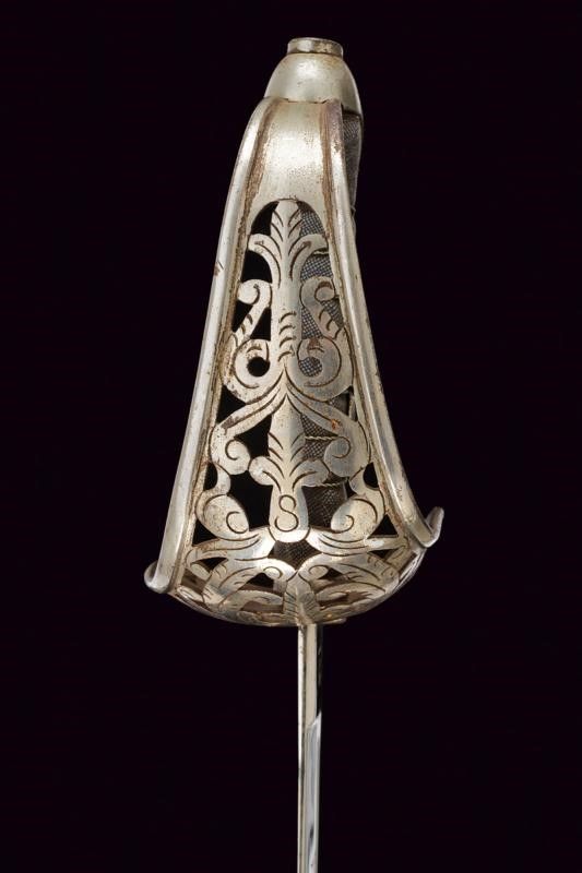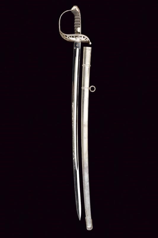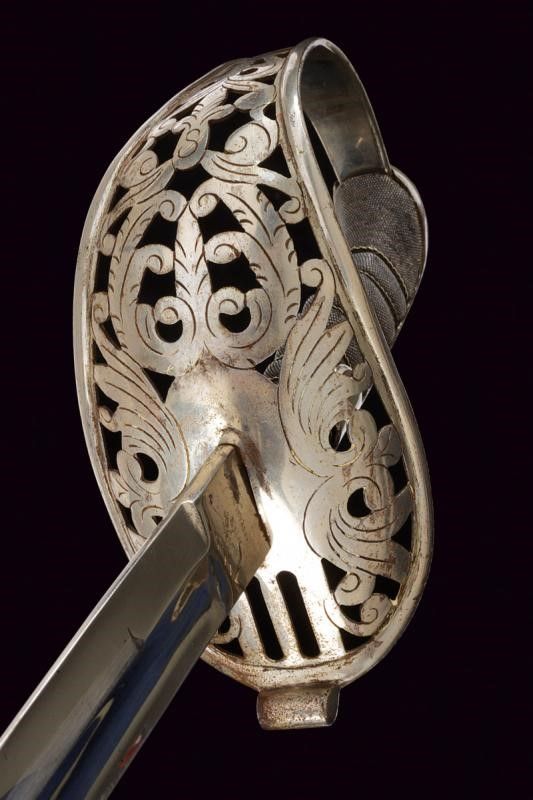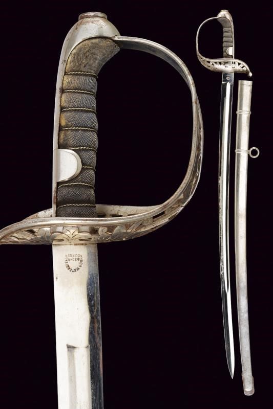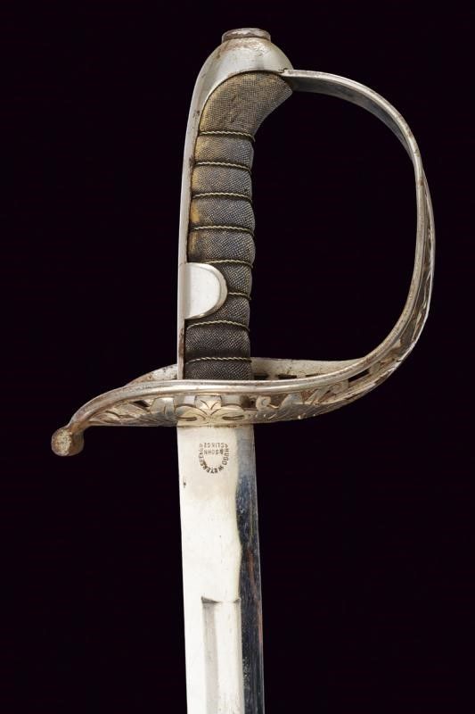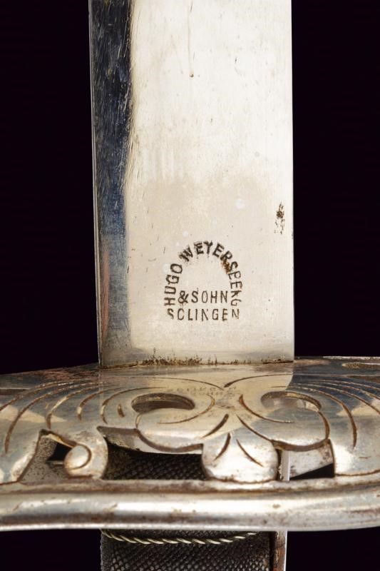 Austria, lunghezza 96 cm. Seconda metà del XIX Secolo Lama curva a un filo, punta e breve controfilo, sgusciata per tre quarti su una faccia, piatta sull'altra, marcata al tallone 'HUGO WEYERSBERG & SOHN / SOLINGEN' su un lato e con una marcatura di Vienna non chiaramente leggibile sull'altro. Fornimento in ferro con ampia guardia traforata e incisa a fiorami. Forse leggermente schiacciata su un lato. Impugnatura con rivestimento in pelle e dotata di trecciola metallica. Cappetta lunga. Fodero in ferro a una campanella fissa e un passante. Vecchia finitura nichelata abbastanza ben conservata.