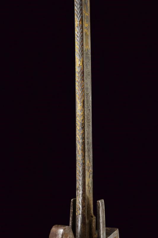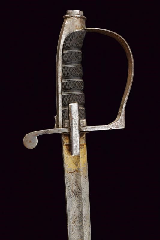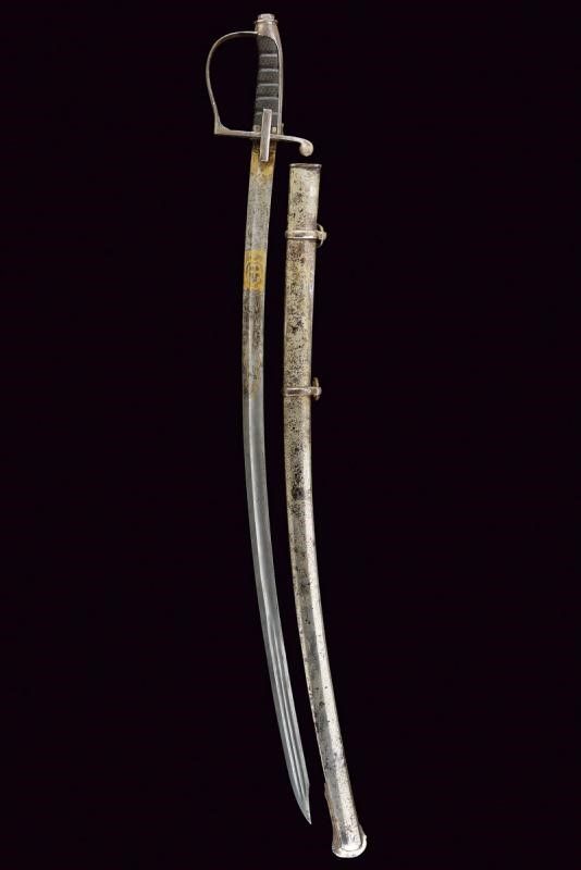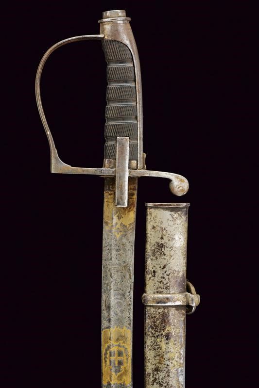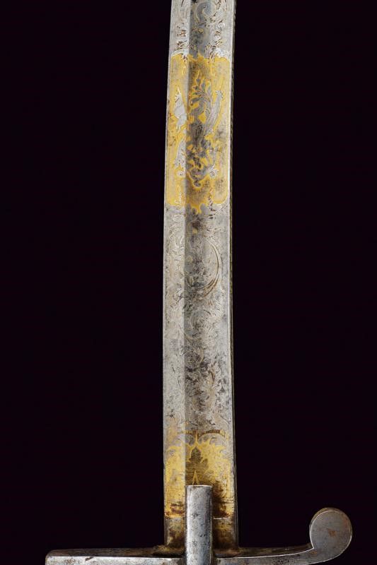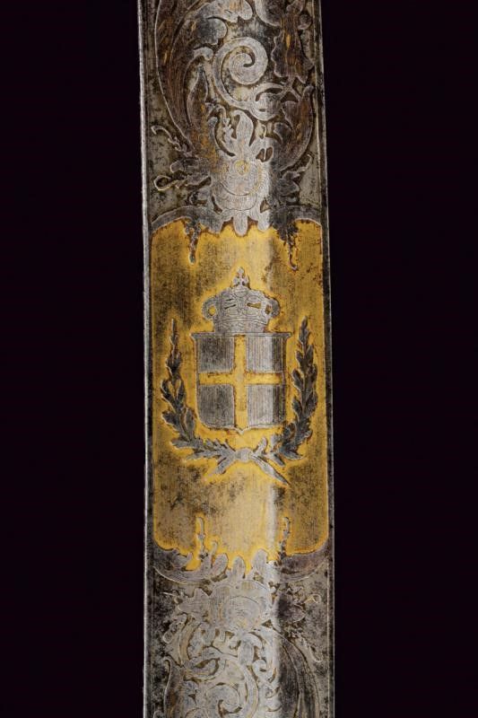 Regno di Sardegna, lunghezza 101 cm. Terzo quarto del XIX Secolo Lama curva a un filo e controfilo, con sguscio che si sdoppia verso il debole; la prima parte con bellissime incisioni a trofei e motivi floreali parzialmente su fondo dorato, su un lato lo stemma sabaudo sotto corona e tra fronde di lauro. Tipico fornimento monoelso. Completo di fodero in ferro a due campanelle, rimane circa il 30% della nichelatura originale.