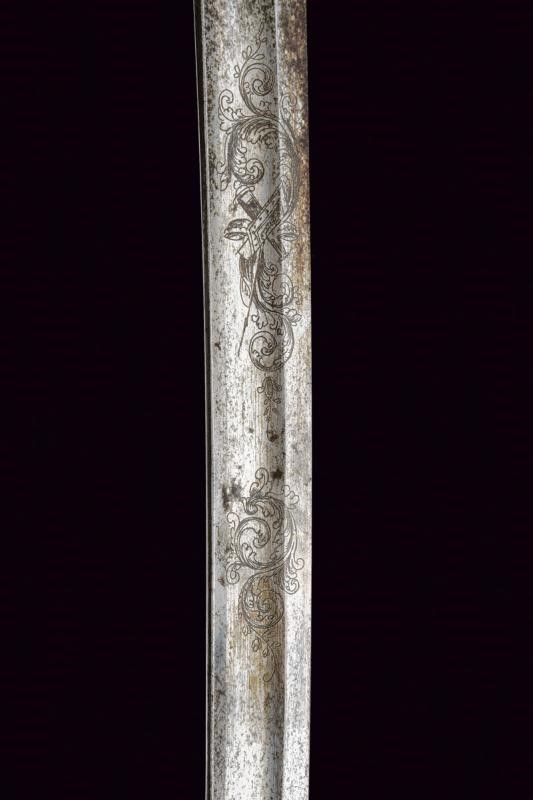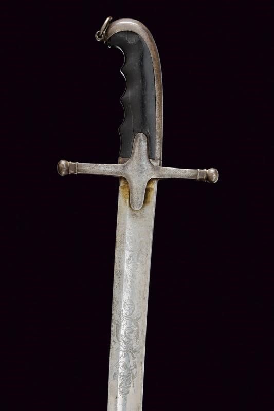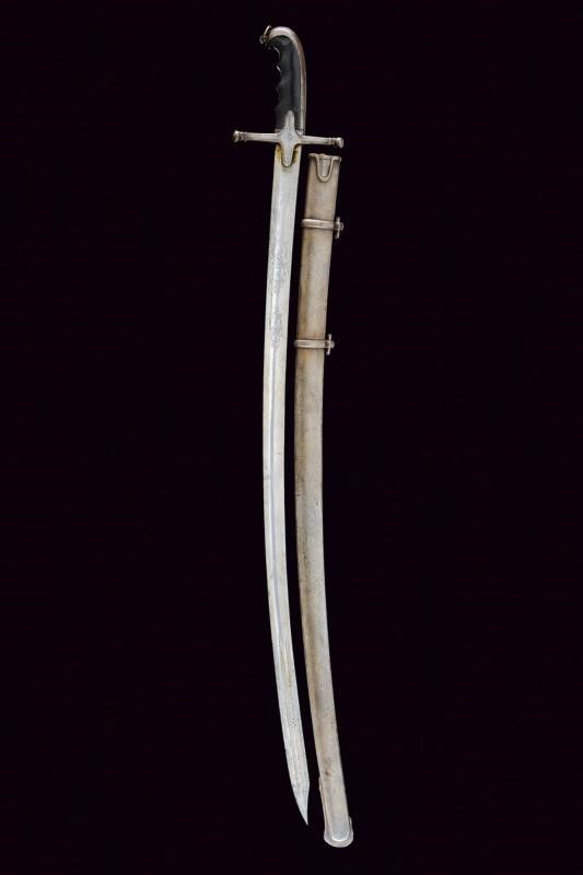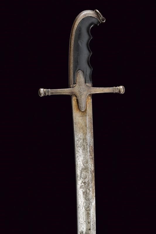 Regno di Sardegna, lunghezza 99 cm. Metà del XIX Secolo Lama curva con scanalatura che si sdoppia verso il debole, ad un filo e controfilo, incisa con trofei e racemi; fornimento in ferro con elso a bracci dritti e bottonati in testa, alette fermafodero, cappetta lunga faccettata, impugnatura anatomica in legno color nero. Fodero in ferro a due campanelle. Rara.