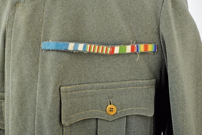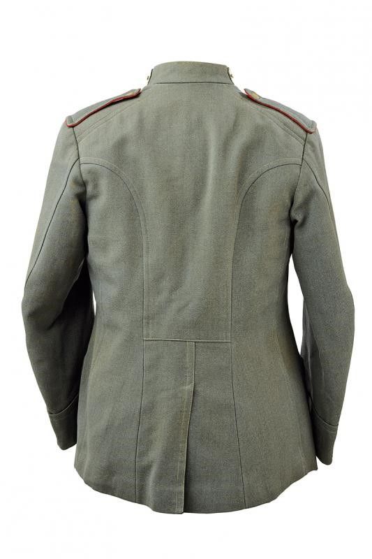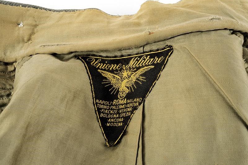 Regno d'Italia, altezza (jacket) 77 cm. 1914-18 Berretto in tessuto grigio verde (qualche buco da tarme), completo di aquila, corona e fascia ricamate; piccoli difetti; completo di soggolo su bottoni in argento; all'interno alluda in pelle e cuffia in seta celeste con timbro in oro dell'unione militare. Giubba in panno grigioverde, completa di effetti e nastro per cinque medaglie. Insieme una fotografia e dedica del generale (Filippini) indirizzata ad un suo tenente; probabilmente mai inviata; in cornice e sotto vetro.