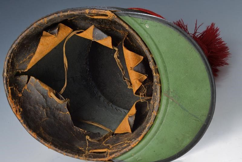 Regno delle Due Sicilie, altezza 19 cm. metà del XIX Sec. Alto coppo in feltro, la parte superiore e la visiera in cuoio, gallone in tessuto rosso; fregio in ottone dorato recante il numero '3', coccarda rossa, pompon rosso; l'interno in pelle. Segni d'uso. Molto raro.